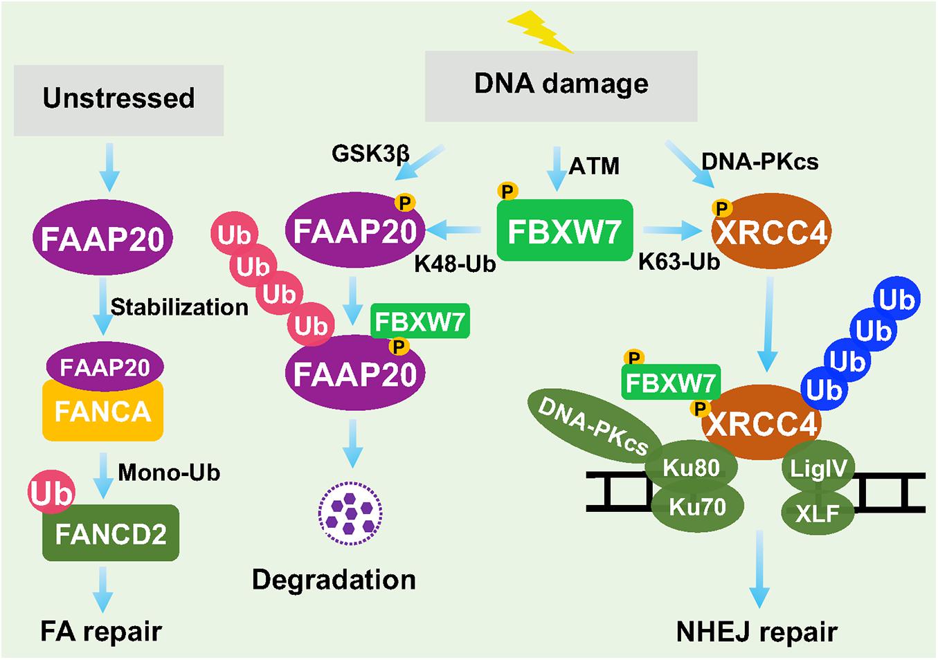 Figure 4. FBXW7 in regulation of DNA repair. Under unstressed condition, FAAP20 binds FANCA to facilitate mono-ubiquitylation of FANCD2. Upon DDR, FAAP20 was phosphorylated by GSK3β to facilitate FBXW7 binding and ubiquitylation. On the other hand, DNA-PKcs phosphorylated XRCC4, whereas ATM phosphorylated FBXW7. At the damage site, FBXW7 promoted XRCC4 polyubiquitylation via the K63 linkage to facilitate recruitment of Ku70/Ku80 for NHEJ repair.