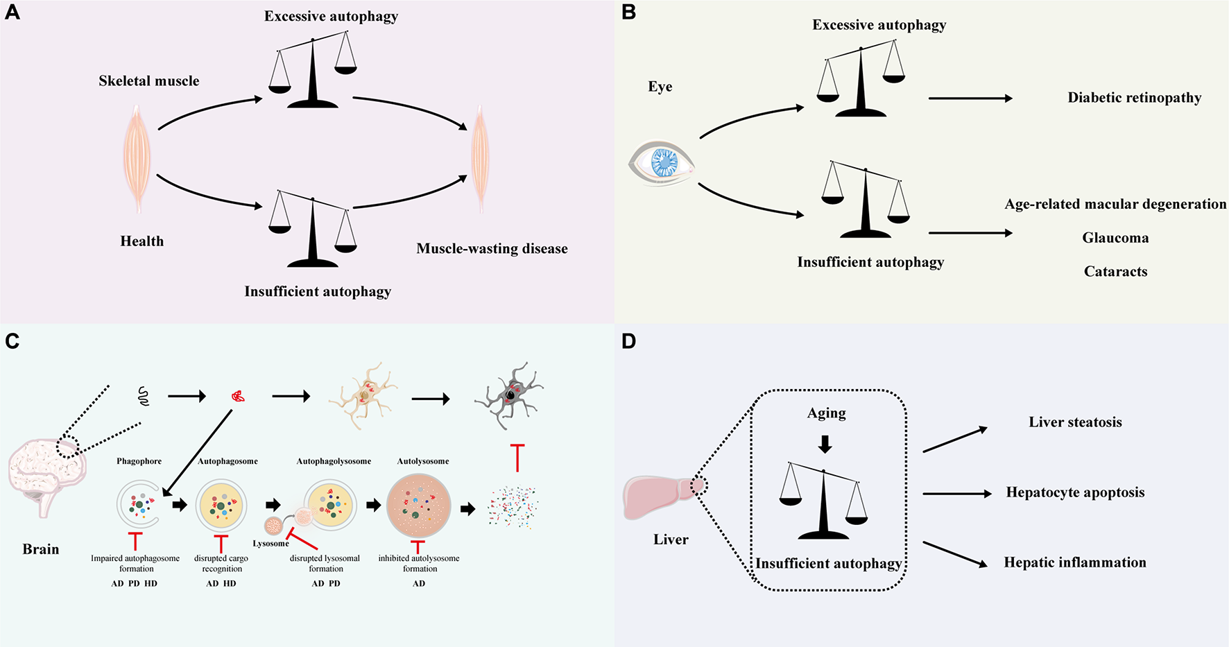 Figure 3. Relationship between autophagy and disease. Schematic depicting the autophagy-related disease in different tissue. (A) In the muscle, both excessive and insufficient autophagy will cause muscle-wasting disease. (B) In the eye, excessive autophagy may lead to diabetic retinopathy, while insufficient autophagy may result in age-related macular degeneration, glaucoma and cataracts. (C) In the brain, the accumulation of misfolded proteins and inclusion bodies is the common pathological hallmark for various neurodegenerative disorders (top). Autophagy may help to eliminate the aggregated proteins and prevent neurodegeneration. Perturbations throughout the autophagic cycle, from autophagosome development to autolysosome formation, have been suggested to cause neurodegenerative disease. The key points in the autophagy pathway along with the associated neurodegenerative diseases are highlighted below. (D) Age-related decline in autophagy may lead to liver steatosis, hepatocyte apoptosis, and hepatic inflammation. AD: Alzheimer’s disease; PD: Parkinson’s disease; HD: Huntington disease.