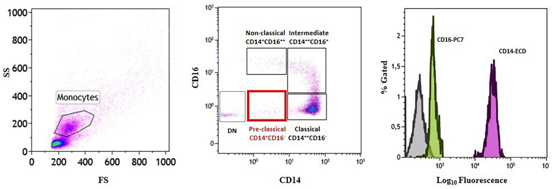 Analysis of the distribution of circulating monocyte subsets according to their CD14 and CD16 surface expression led to the identification of a fourth monocyte population other than the three already known subsets (classical, CM: CD14++CD16–; intermediate, IM: CD14++CD16+; non-classical, NCM: CD14+CD16++). In line with CD14 and CD16 surface staining, the newly identified cells were CD14+CD16– (Figure 2 and Table 2). We decided to label this novel subset as “pre-classical monocytes” (PCM) because of their proximity to the CM while observing the flow-cytometry acquired event distribution on dot plots.