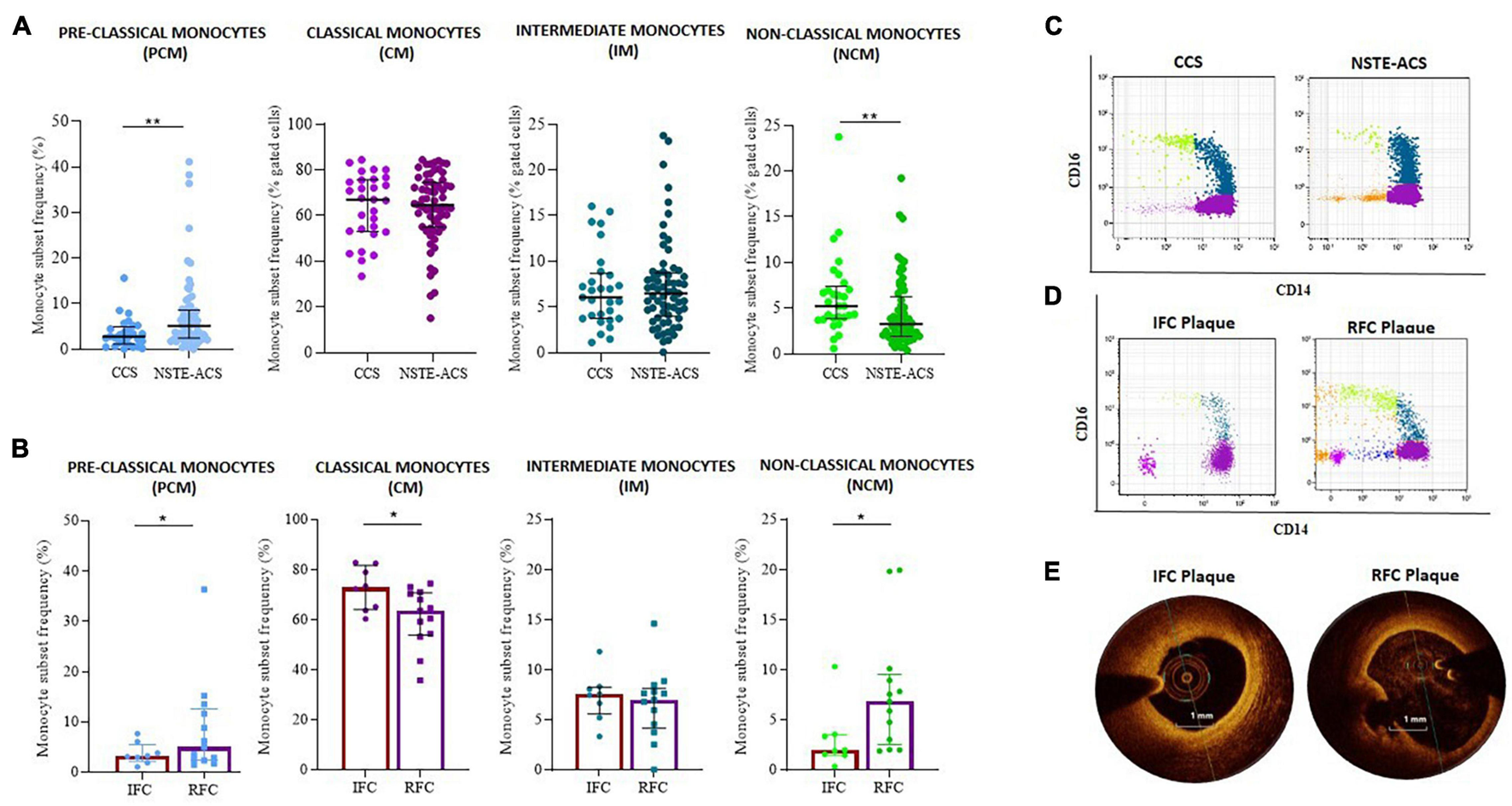 Figure 3. Distribution of monocyte subsets between chronic coronary syndrome (CCS) and non-ST elevation acute coronary syndrome (NSTE-ACS) patients and its relationship with plaque phenotype at optical coherence tomography (OCT) investigation. (A) Frequency of pre-classical, classical, intermediate, and non-classical monocytes in CCS (n = 30) and NSTE-ACS (n = 69) patients and (B) in NSTE-ACS patients with evidence of intact fibrous cap (IFC, n = 8) and ruptured fibrous cap (RFC, n = 13) plaques according to OCT investigation. Two representative dot plots showing monocyte subset distribution (C) in CCS and NSTE-ACS patients and (D) in NSTE-ACS patients presenting with IFC and RFC plaques. (E) Two representative OCT images of IFC and RFC plaques. Data are presented as mean ± SD; *p < 0.05, **p < 0.01.