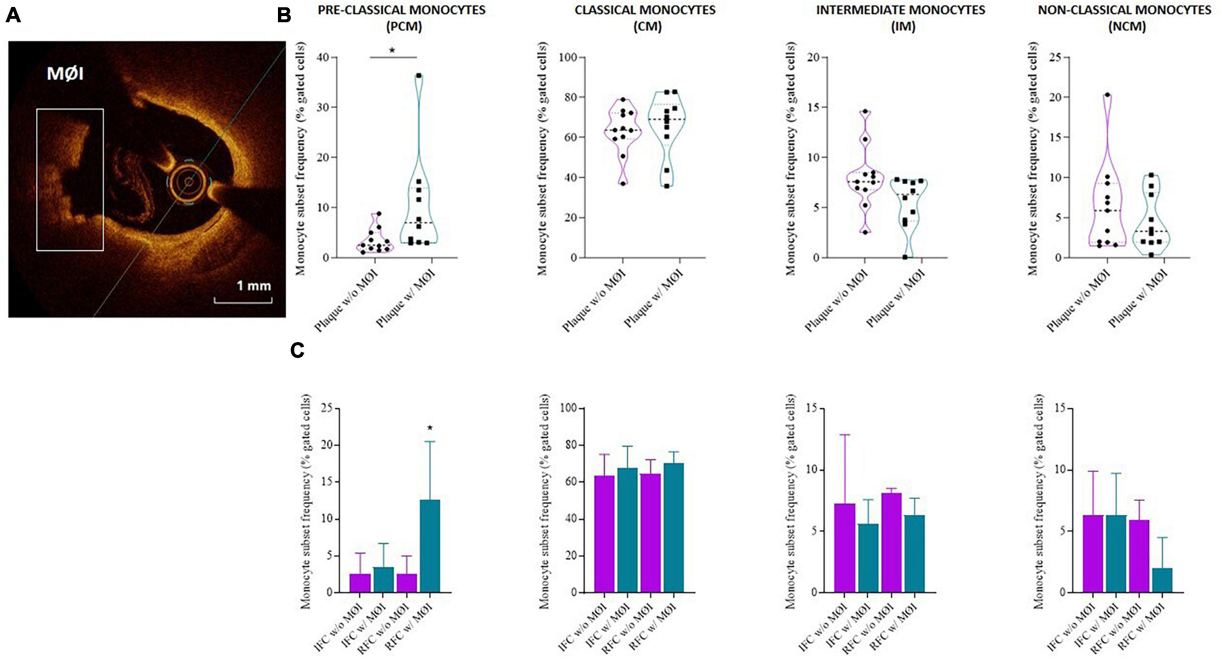 Figure 4. Distribution of monocyte subsets in non-ST elevation acute coronary syndrome (NSTE-ACS) patients according to plaque erosion (IFC) or rupture (RFC) and local macrophage infiltration (MØI). (A) Representative optical coherence tomography (OCT) image of MØI. (B) Frequency of circulating monocyte subsets in NSTE-ACS patients according to OCT-MØI assessment, (C) and according to both plaque morphology (IFC versus RFC) and MØI. Data are presented for panel (B) as median and interquartile range and for panel (C) as mean ± SD; *p < 0.05.
