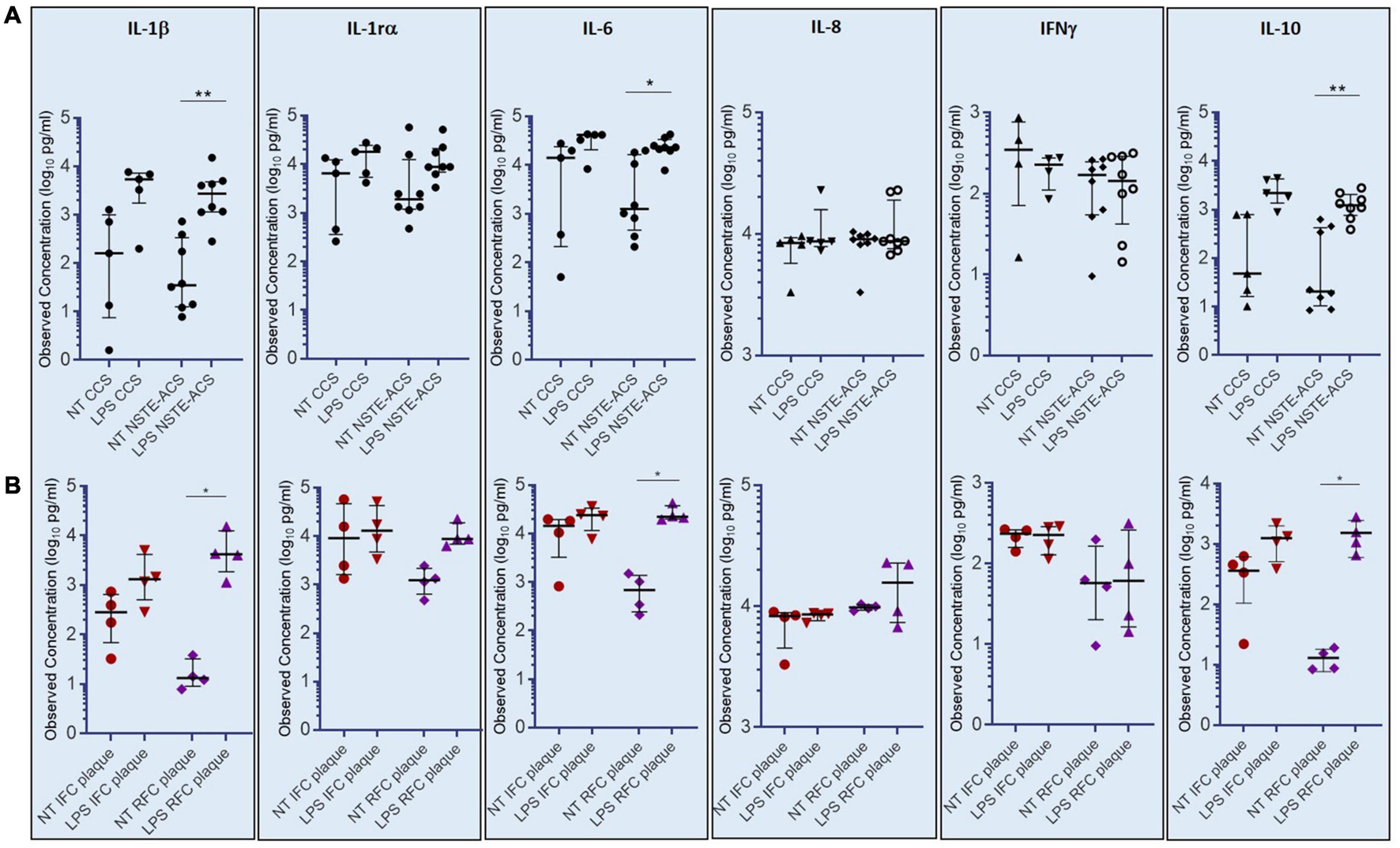 Finally, the LPS-treatment of circulating PBMCs of NSTE-ACS patients affects the pro-inflammatory (IL-1β, IL-6) as well as anti-inflammatory (IL-10) cytokine release in cell-culture supernatants, especially in patients with RFC, suggesting that the intensity of the individual response to potential inflammatory stimuli may play a major role in determining the magnitude of the inflammatory reaction and clinical outcome (Liuzzo et al., 2001). These in vitro findings support our previous observation that NSTE-ACS with RFC are characterized by the expansion of an unusual subset of T cells committed to production of immunomodulatory cytokines, such as IL-12 and interferon (IFN)-γ (Ruggio et al., 2019). As these cytokines induce a rapid priming of human monocyte functions, their chronic up-regulation could lead to subsequent activation of monocytes/macrophages in the circulation as well as in tissue lesions.