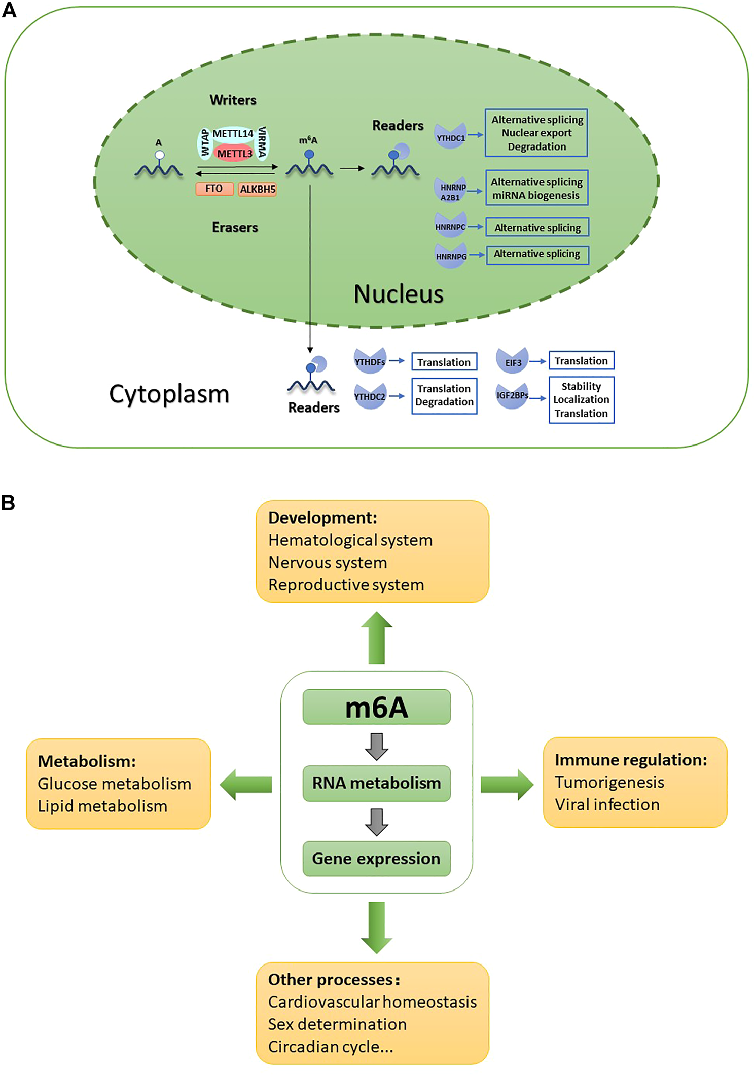 m6A modification is precisely regulated by writers, erasers and readers and is involved in all aspects of RNA metabolism; moreover, its effects are not limited to mRNAs (Figure 1A). Through regulating gene expression, m6A is involved in diverse biological process including development, metabolism, immunity regulation, sex determination, circadian rhythms, and cardiovascular system homeostasis (Hu et al., 2020; Gu et al., 2021) (Figure 1B).