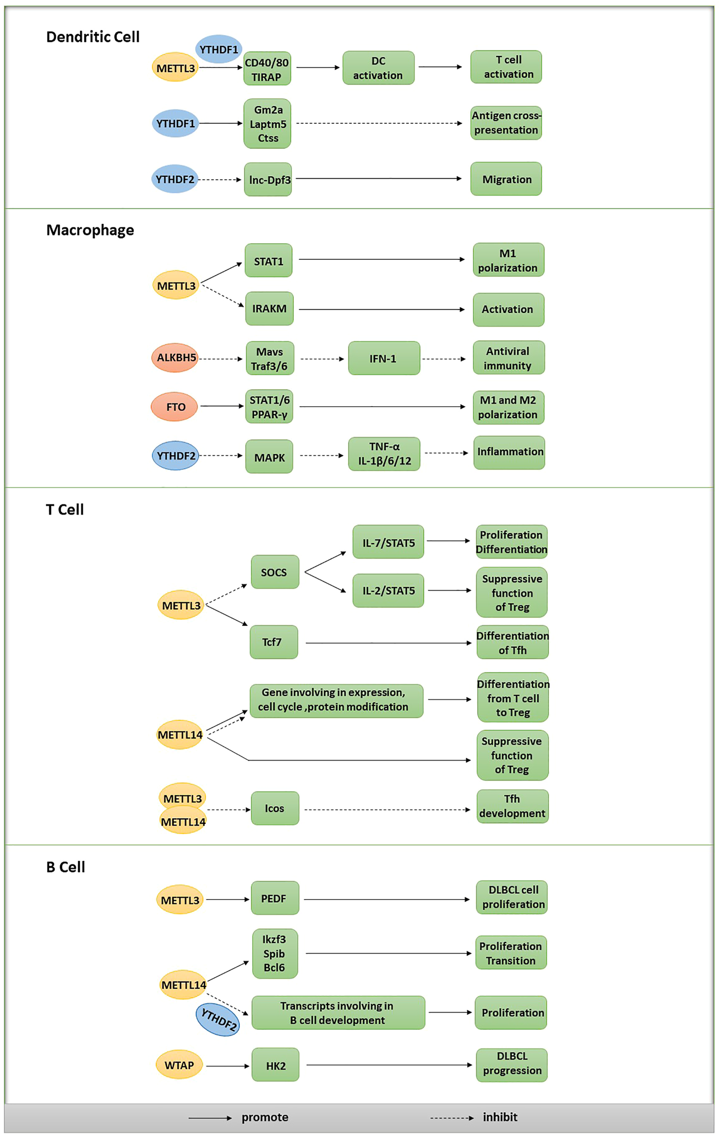 The precursor hematopoietic stem cells located in the bone marrow are the original source of all immune cells in the blood, lymph and immune organs. Immune cells are classified as innate immune cells and adaptive immune cells according to their functions and patterns in the immune response. Innate immune cells primarily include DCs, macrophages, granulocytes and mast cells that respond rapidly to antigenic stimuli. Adaptive immune cells primarily include T lymphocytes (CD4+ T cells and CD8+ T cells) and B lymphocytes that initially exhibit a delayed response but are involved in the formation of immunological memory to respond strongly and rapidly to repeated stimulation with the same antigen. In addition, other types of immune cells, such as natural killer (NK) cells and NK-T cells, are components of both immune systems (McComb et al., 2019). Based on accumulating evidence, m6A is required for many processes in immune cells, including development, differentiation, activation, migration and polarization, thereby modulating the immune response (Figure 2).