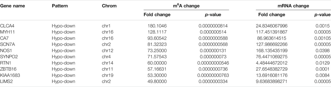 Using conjoint analysis of MeRIP-seq and RNA-seq data, 400 genes with differential m6A methylation and differential expression were identified. Among the 118 m6A hypermethylated genes, 117 genes had upregulated mRNA expression, and one gene had downregulated mRNA expression (Figure 4A). The top 10 hypermethylated and upregulated genes with the highest methylation fold changes were listed in Table 3. Additionally, there were 281 downregulated genes and one upregulated gene among the 282 m6A hypomethylated genes (Figure 4A). The top 10 hypomethylated and downregulated genes with the highest methylation fold changes were listed in Table 4. Almost all genes showed the same trend of methylation and expression. Hyper-methylation was accompanied by upregulation of mRNA expression, while hypo-methylation was accompanied by downregulation of mRNA expression. The results showed that the methylation of mRNA in CRC tissues may maintains the stability of mRNA and promotes post-transcriptional translation of mRNA.