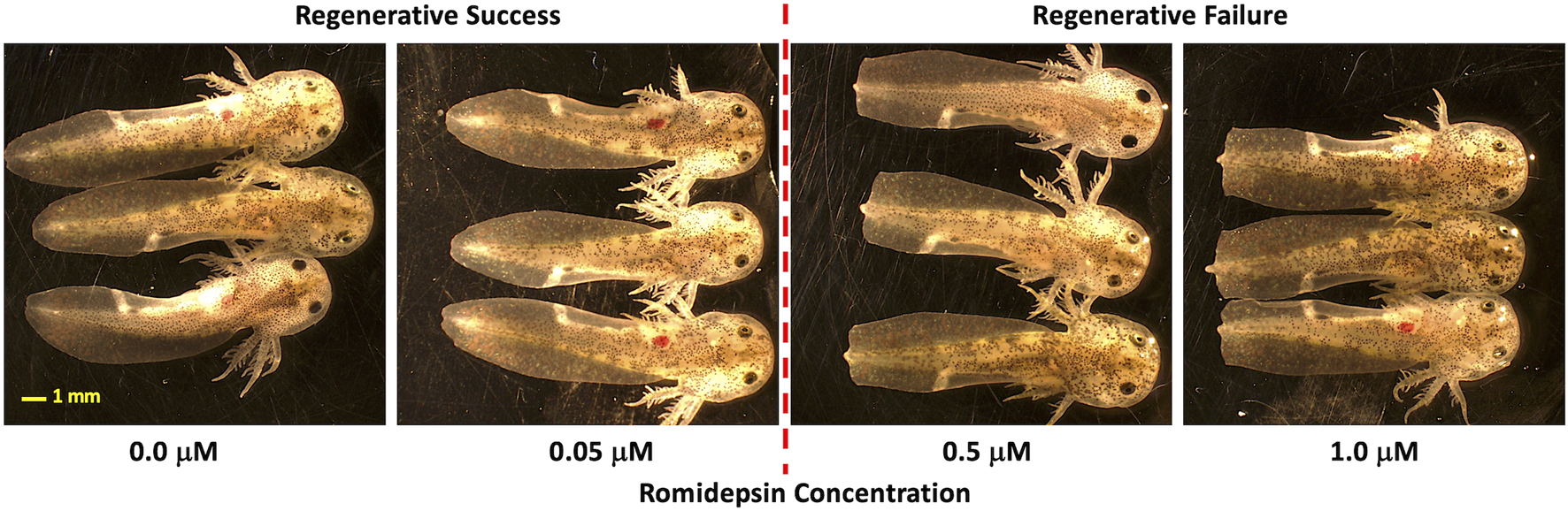 Developmental stage 42 (Bordzilovskaya et al., 1989) axolotl embryos were manually hatched by removing the egg jelly and membrane, anesthetized in 0.02% benzocaine, and tail amputations were performed with a sterile razor blade to remove 2 mm (∼20% of the body length) of the distal tail tip. Axolotl embryos were then distributed into 12-well microtiter plates containing romidepsin or axolotl rearing water (ARW) with DMSO. Romidepsin (Selleckchem, Cat. No. S3020) was dissolved in DMSO and diluted to a stock concentration of 10 mM. The romidepsin stock solution was subsequently diluted to a range of concentrations (0, 0.05, 0.1, 0.5, 1.0, 5.0, and 10.0 μM) and 2 replicates of 3-6 embryos were treated for 6 or 12 h per concentration, and embryos were imaged at 6 days post-amputation (DPA) using an Olympus dissecting microscope with ×0.5 objective lens and DP400 camera. These initial concentration experiments were performed to identify the critical concentration, above and below which regeneration succeeds or fails. Distal tail shape was used to classify concentrations as inhibitory or having no effect on tail regeneration at 6 DPA (Voss et al., 2019).