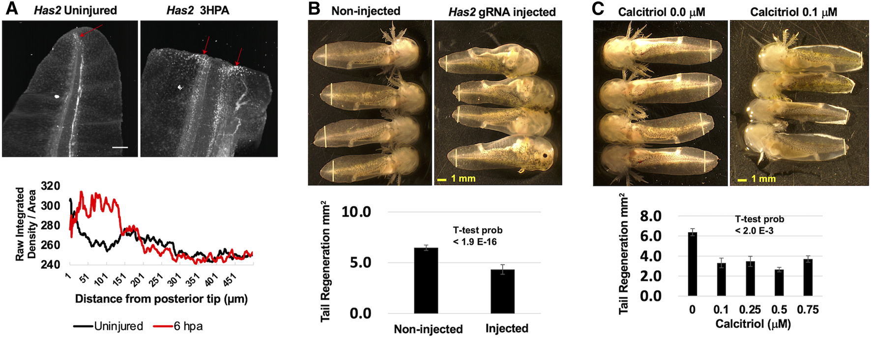 The functional role of Has2 in axolotl embryo tail regeneration was evaluated by CRISPR-Cas9 gene editing and chemical inhibition using calcitriol. First, tw guide RNAs (TGGCTACCAATTCATCCAGA; GCTCGTCCTCTCCAACAAGT) were designed against Has2 protein-coding sequence and two target-specific Alt-R crRNAs and common Alt-R tracrRNA were synthesized by Integrated DNA Technologies (Amex_G.v6 genome assembly HAS2|AMEX60DD301040413.1). Alt-R–Cas9 Ribonucleoprotein complexes for both guide RNAs were prepared and injected into 1-cell stage axolotl embryos as described previously (Trofka et al., 2021). Thirty-two injected and 10 non-injected control embryos were reared to developmental stage 42 and tail tips were amputated as described above. Tail tips from 6 injected embryos were used to test for CRISPR-Cas9 gene editing by DNA isolation (Monarch Genomic DNA Isolation Kit), PCR (Forward Primer: 5-AAATAGTCTGGCAGATTCCAATTC-3; Reverse Primer: 5-CATTCATGAACAGACTGAAAGGAG-3) and DNA sequencing (Eurofins). PCR was performed usin 34 cycles (95°C 45 s, 60°C 45 s, and 72°C 30 s) and an Applied Biosystems Veriti 96-well thermocycler. PCR products were prepared for sequencing using Exo-Cip (New England Biolabs). At 7 DPA, the amount of tail tip tissue regenerated was quantified from images obtained using the Olympus microscope and camera described above, using the polyline tool in the Olympus cellSens standard 1.5 imaging software program to outline the area of the tail between the amputation plane and distal tail tip. Second, tail tips of developmental stage 42 embryos were amputated, and embryos were treated with Has2 inhibitor calcitriol (Narvaez et al., 2020), the active form of vitamin D. Calcitriol was purchased from Selleckchem.com and diluted to 10 mM using DMSO. Four embryos (per each concentration tested) were treated using 0.0, 0.1, 0.25, 0.5, 0.75, and 1.0 μM and reared to 7 DPA for imaging of the amount of tissue regenerated. The amount of tissue regenerated was quantified as described above.