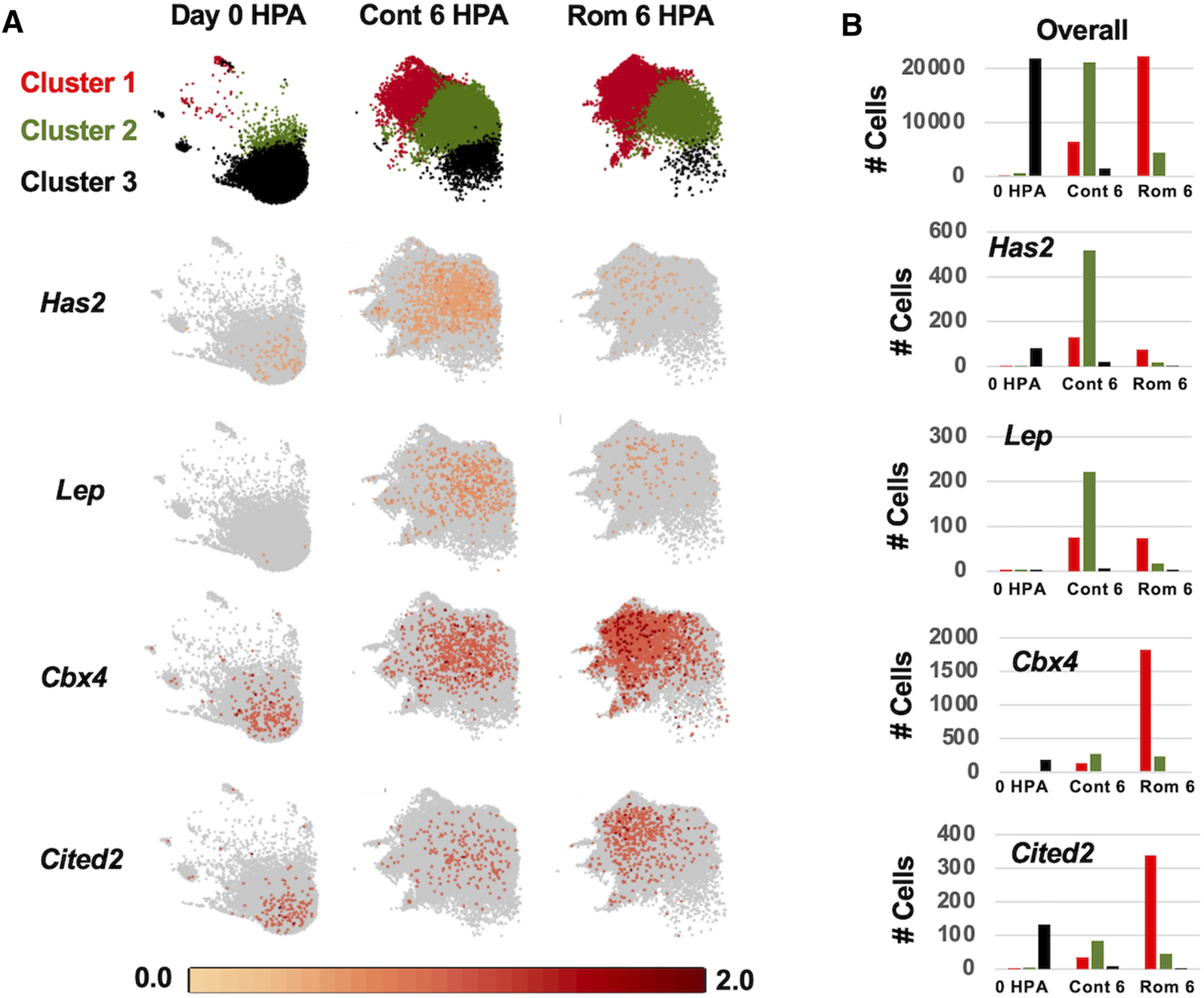 FIGURE 5. Log2 expression of regeneration associated genes among control 0 HPA, control 6 HPA, and romidepsin 6 HPA samples for clusters 1–3. (A) At 0 HPA, the majority of cells were observed in cluster 3 (black). At 6 HPA, there were few cluster 3 cells and the proportion of cluster 1 (red) and cluster 2 (green) cells varied between the control and romidepsin-treated samples. Has2 and Lep were expressed more highly in Cont 6 HPA while Cbx4 and Cited2 were expressed more highly in Rom 6 HPA. (B) Number of cluster 1-3 cells expressing Has2, Lep, Cbx4, and Cited2 among samples.