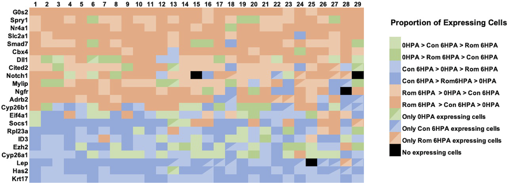 Several genes from the Nanostring experiment showed similar transcriptional responses to romidepsin. As described above, Lep and Has2 response curves were sigmodal with high and low expression associated with regenerative success and failure outcomes, respectively. A correlated pattern of gene expression, detected at the tissue level, could reflect correlated changes in gene expression across a few or many cell types. To examine these possibilities, we determined the proportion of expressing cells for each library and cell type combination, again focusing on the 29 validated romidepsin-responsive genes. For this analysis, we conservatively required that a gene be expressed in greater than 5% of cells within at least 1 cell type; this filter eliminated 7 of the 29 genes. We then classified genes using rank ordering to show how they were expressed at the cellular level among the three snRNA-Seq libraries (Figure 7). For example, the proportion of expressing cells for a given cell type could be highest in the Rom 6 HPA library, next highest in the Cont 6 HPA library, and lowest in the 0 HPA library. This classification was most frequently observed for genes that were previously shown to be up regulated (e.g., Cited2, Cbx4) by 10 μM romidepsin, which was inhibitory to regeneration. Strikingly, this gene classification, or the next closest gene classification where the proportion of Rom 6 HPA cells was also highest overall (Rom 6 HPA >0 HPA > Cont 6 HPA), was observed across the majority of cell types. Alternatively, Cont 6 HPA > ROM 6 HPA > 0 HPA and Cont 6 HPA > 0 HPA > Rom 6 HPA classifications were more frequently observed for regeneration associated genes that were down regulated by 10 μM romidepsin, and again, these classifications were observed across cell types. We note that when the highest proportion of expressing cells was observed for the 0 HPA library, the classification 0 HPA > Rom 6 HPA > Cont 6 HPA was more frequent for genes up-regulated by 10 μM romidepsin while the classification 0 HPA > Cont 6 HPA > Rom 6 HPA was more frequent among genes that were down-regulated by 10 μM romidepsin. The non-random patterns observed in Figure 7 strongly suggest that key regeneration genes were not exclusively expressed by distinct cell types. Instead, transcriptional regulation appeared to be integrated across cell types by HDAC activity.