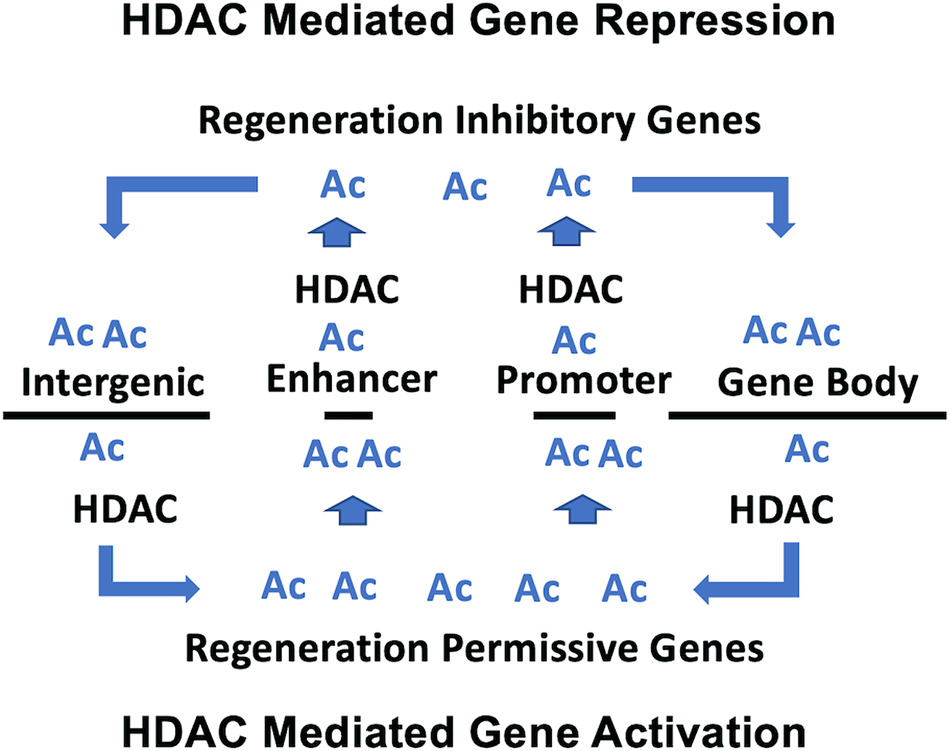FIGURE 8. Model proposed for HDAC-mediated transcriptional regulation during tail regeneration. For HDAC mediated gene repression, HDAC activity is associated with promotor/enhancer regions to compact chromatin and prevent accessibility of transcription promoting factors. For HDAC mediated gene activation, HDAC activity is associated with intergenic regions and gene bodies, which increases the pool of acetyl lysine residues for hyperacetylation of promotor/enhancer regions and the recruitment of transcription promoting factors.