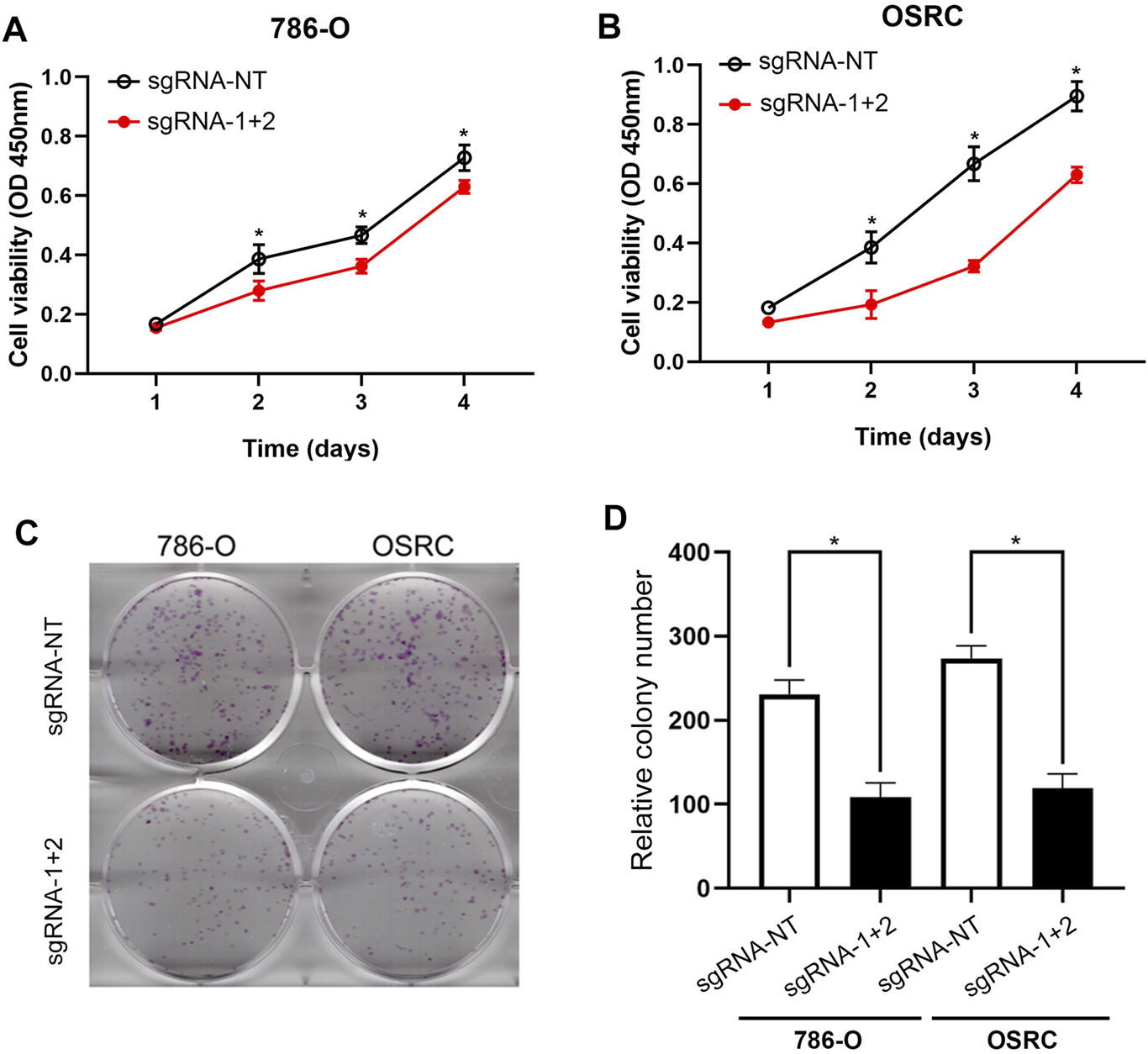 Hypermethylation of LncRNA NEAT1 repressed the RCC cells proliferation. (A,B) CCK-8 assays of 786-O and OSRC cells after transfected with dCas13b-METTL3 and sgRNAs. (C,D) Colony formation assay for 786-O and OSRC cells after transfected with dCas13b-METTL3 and sgRNAs. *p < 0.05.