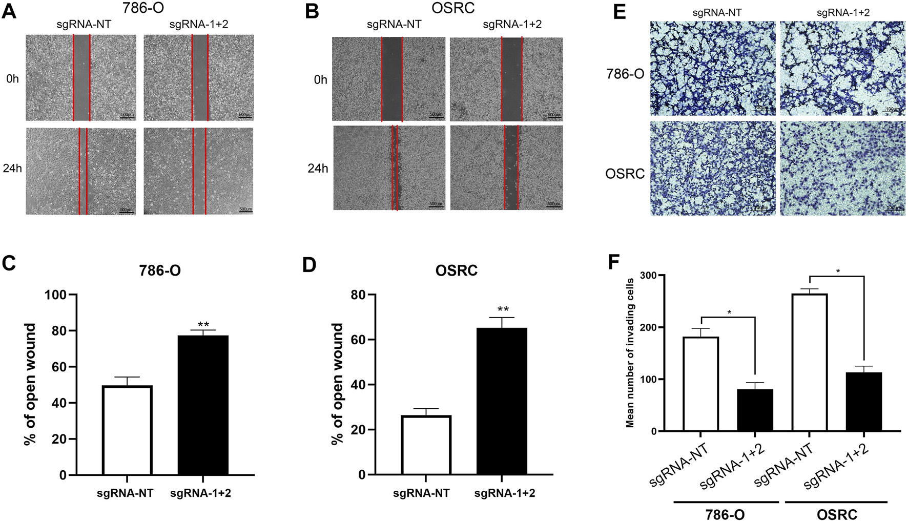 Next, we determined the RCC cells migration after hypermethylated LncRNA NEAT1. The results of wound-healing assays and transwell assays exhibited that LncRNA NEAT1 hypermethylated 786-O and OSRC cells had a decreased migration ability compared to that in the control cells (Figures 4A–F). These data showed that hypermethylated LncRNA NEAT1 by dCas13b-METTL3 repressed the migration of RCC cells.