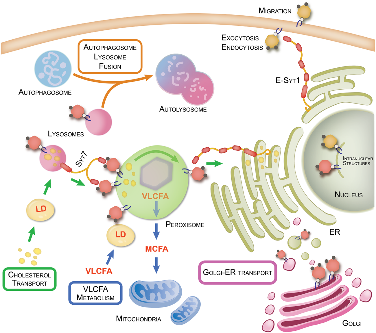 | Peroxisome | Syt-7 on the lysosome | Trafficking of cholesterol from lysosome | Chu et al. (2015) |