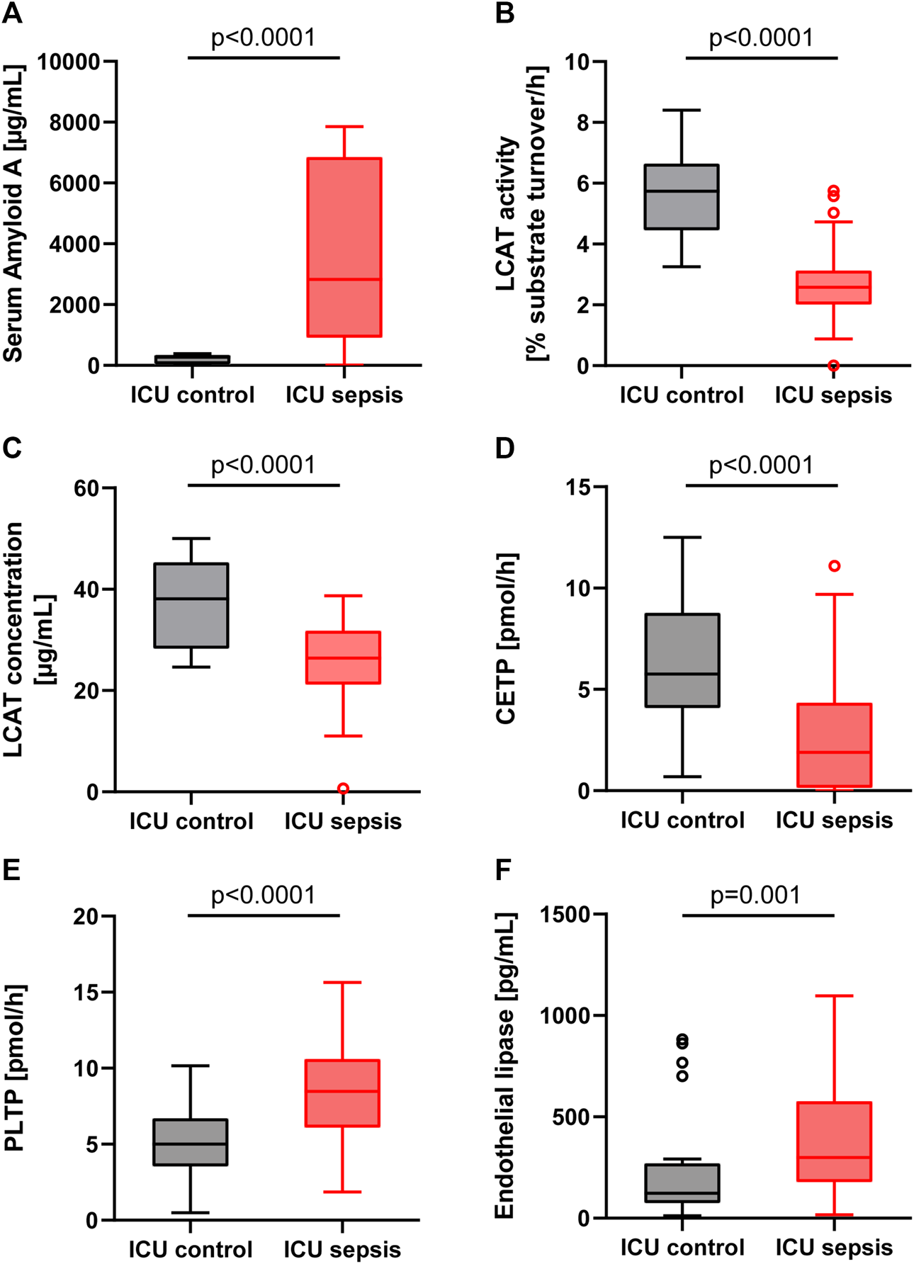 Boxplots for the ICU control group (patients without sepsis or bacteremia) and ICU sepsis group. (A): Serum Amyloid A (SAA). (B): Lecithin-cholesterol acyltransferase (LCAT) activity. (C): Lecithin-cholesterol acyltransferase (LCAT) concentration. (D): Cholesteryl ester transfer protein (CETP). (E): Phospholipid transfer protein (PLTP). (F): Endothelial lipase (EL). Note that in the EL boxplot two outliers in the sepsis group (17,436 and 1,659 pg/ml) and one outlier in the control group (2,839 pg/ml) are not displayed.