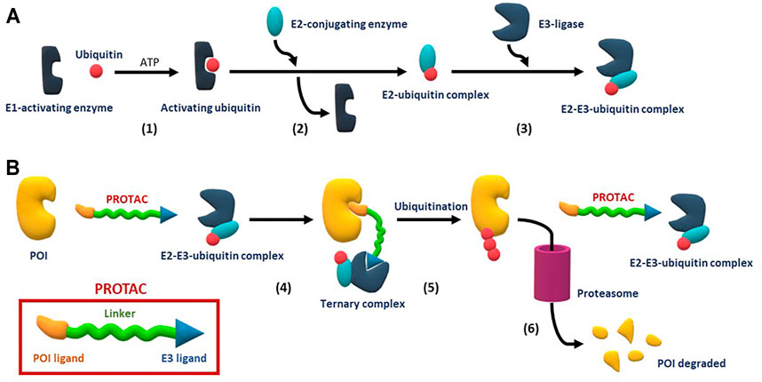 Figure 1. Representation of PROTACs structure (see inset red box), interactors, and mechanism of action. (A) Ubiquitination process: (1) Ubiquitin is activated by an E1-enzymatic protein in an ATP-dependent process, (2) the activated ubiquitin is transferred to a E2-conjugating enzyme, (3) the target protein is joined to the E2-ubiquitin via an E3-ligase enzyme, giving rise to an E2-E3-ubiquitin complex; (B) Mechanism of action of PROTACs divided into three steps: PROTACs are able to approach the protein of interest and the E3/E2/Ub complex forming ternary complexes (4), which allows the E3/E2/Ub complex to transfer ubiquitins to the target proteins (5) which, once tagged, are recognized by the proteasome for degradation (6).