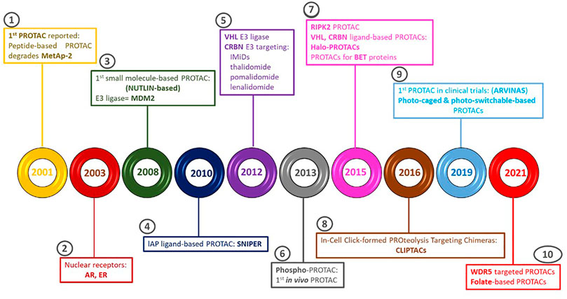 Figure 2. The 10 main events related to PROTACs technology development for clinical translation. (1)The first PROTACs technology based on a peptide was reported to degrade Methionine aminopeptidase 2 (MetaP2), an enzyme overexpressed in many forms of cancer (Sakamoto et al., 2001). (2) Novel PROTACs that induced degradation on androgen (AR) and estrogen (ER) receptors confirmed the proof of preclinical efficacy. (3) The first small-molecule PROTACs was reported in 2008, configured by murine double minute 2 (MDM2) as E3-ligase (Schneekloth et al., 2008). (4) Inhibitors of apoptosis proteins (IAP) were attained in the PROTACs structure as E3-ligase (Itoh et al., 2010). (5) Not only peptidomimetic ligands for VHL E3 were developed but CRBN E3 was identified as molecular targeting for immunomodulators, thalidomide, pomalidomide and lenalidomide (Ito et al., 2010; Itoh et al., 2010; Buckley et al., 2012). (6) The first PROTACs working in vivo, phosphor-PROTACs, were capable of inhibiting the tumoural growth in murine models, differentiating between various receptor tyrosine kinases (RKT) signalling routes (Hines et al., 2013). (7) The serine-threonine-protein kinase (RIPK2) receptor-interactor PROTACs that selectively induced degradation of RIPK2 at low doses were developed. Simultaneously, the usefulness of VHL E3 to facilitate guided degradation was demonstrated by its inclusion in HaloPROTACs. Additionally, PROTACs using Bromo and Extraterminal domains (BET) inhibitors targeting BET proteins, using both CRBN and VHL, were developed (Bondeson et al., 2015; Winter et al., 2015). (8) In-cell CLIck-formed Proteolysis Targeting Chimeras (CLIPTACs) were developed by Astex Pharmaceuticals (Lebraud et al., 2016). (9) Arvinas developed the first PROTAC tested in clinical trials. Photocontrol groups were incorporated into PROTACs (Xue et al., 2019) (10) New WDR5 targeting PROTACS were designed based on existing WDR5 ligands (Poso 2021), and folate based PROTACs were released to specifically deliver PROTACs in a controllable manner to degrade the POI, thus eliminating potential unwanted toxicity to normal tissues (Liu et al., 2021c).