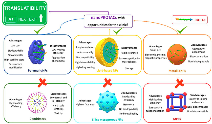 Figure 3. Advantages and disadvantages of different drug delivery systems for the rapid translatability of nanoPROTACs. MOFs and silica mesoporous NPs are not biodegradable and biocompatible, dendrimers are mainly toxic and difficult to scale their synthesis, metallic NPs are easily accumulated in the body and cause aggregation phenomena, lipid-based NPs reach high drug loading, but their half-life in blood might limit their clinical implementation, polymeric NPs are the most potential candidates for clinical translation due to their high biocompatibility, and payload and surface modification flexibility.