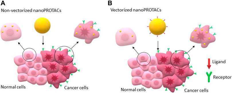 As mentioned above, the design of PROTACs faces different limitations particularly when translating into clinical scenarios, where no target specificity exists, and a narrow therapeutic index could be anticipated, particularly if the warhead ligand targets pan-essential proteins. In this context, optimization of the delivery of PROTACs through the use of vectorized nanocarriers can augment efficacy preserving an adequate safety profile (Juan et al., 2020b; 2020a). Figure 4 illustrates the mechanism of action of vectorized NPs.
