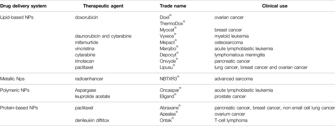 Concerning cancer therapies using lipid-based NPs, only liposomes have been approved by the Federal Drug Administration (FDA) (see Table 2). In this sense, Doxil®, a liposomal doxorubicin formulation functionalized with polyethylene glycol (PEG), was the first nanomedicine against cancer approved by FDA. Shortly afterwards, FDA approved other liposomal formulations such as liposomal daunorubicin (DaunoXome®), liposomal vincristine (Marqibo®) and, more recently, liposomal irinotecan (Onivyde®) (Mitchell et al., 2020).
