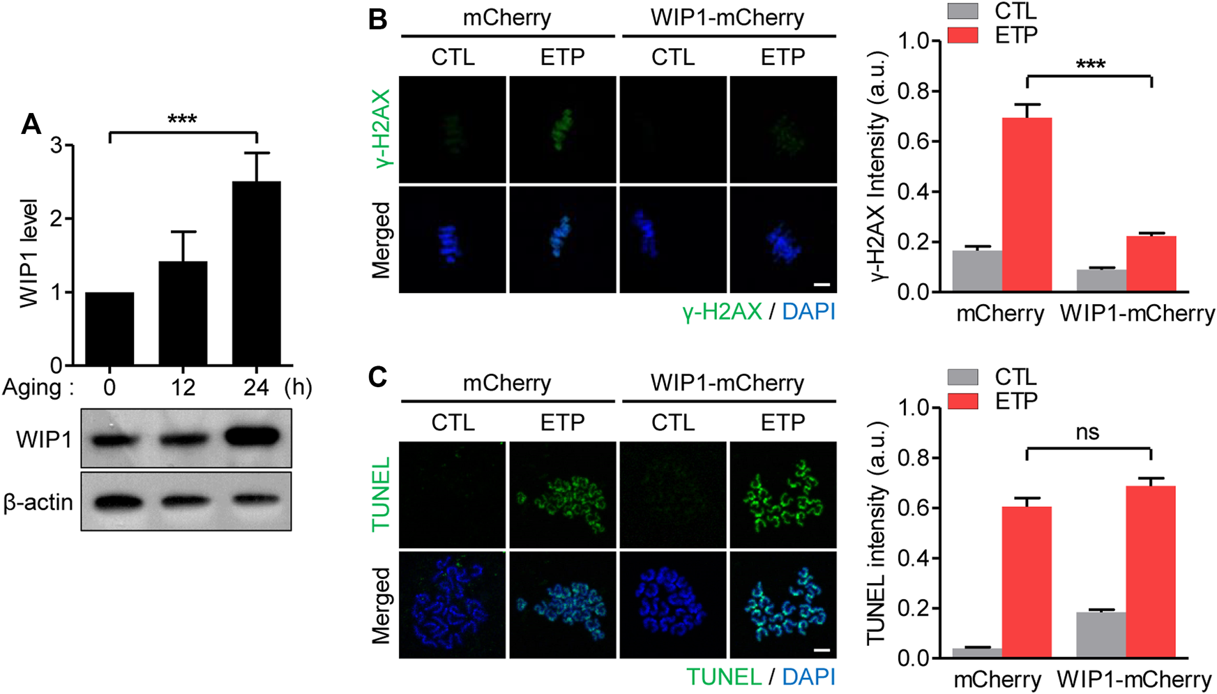 Because WIP1 suppresses the DNA damage response in immature oocytes arrested in the G2/prophase (Leem et al., 2018), we wondered whether the reduced response to DNA damage in aged oocytes was associated with the WIP1 level. To investigate that possibility, we determined the WIP1 expression of oocytes during in vitro aging. Surprisingly, WIP1 levels were increased at 12 h of aging and markedly elevated after 24 h of aging (Figure 2A). To understand the correlation between the increased WIP1 level and the decreased DNA damage response, we ectopically overexpressed WIP1 and examined the DNA damage response in oocytes. Immature G2/prophase-arrested oocytes were injected with mRNA encoding either mCherry or WIP1-mCherry and matured to the MII stage to allow protein overexpression. Although the percentage of oocytes that matured to the MII stage decreased slightly after WIP1 overexpression, a significant portion of the oocytes overexpressing WIP1 progressed to the MII stage with the normal configuration of spindle and chromosomes (Supplementary Figure S1). Therefore, MII oocytes overexpressing WIP1 were used to investigate the effect of increased WIP1 levels on the DNA damage response. In the absence of etoposide treatment, γ-H2AX levels were barely detectable in both the control and WIP1-overexpressing oocytes. After etoposide treatment, γ-H2AX levels increased dramatically in the control oocytes, but the increase in γ-H2AX levels was diminished in the WIP1-overexpressing oocytes (Figure 2B). The TUNEL assay revealed that the degree of DNA damage following etoposide treatment was similar between the control and WIP1-overexpressing oocytes (Figure 2C). These results, along with the reduced γ-H2AX levels in response to the same degree of DNA damage in aged oocytes, suggest that increased WIP1 levels during in vitro aging suppresses the capacity of oocytes to respond to DNA damage.