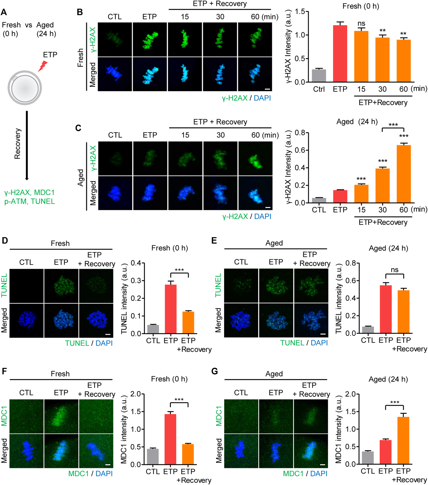 Oocytes lose their capacity to respond to DNA DSBs with in vitro aging. (A,B) MII oocytes were aged in vitro for 0, 6, 12, and 24 h, exposed to 50 μg/ml etoposide (ETP) for 15 min, and then subjected to either the TUNEL assay (A) or γ-H2AX staining (B). Oocytes were treated with DMSO as a control (CTL). The intensity of the fluorescence signals was quantified, and representative images are shown. DNA was counterstained with DAPI. Scale bar, 10 μm. Data were analyzed by one-way ANOVA followed by Tukey’s post hoc test and are expressed as the mean ± SEM of three independent experiments. ***p < 0.0001.