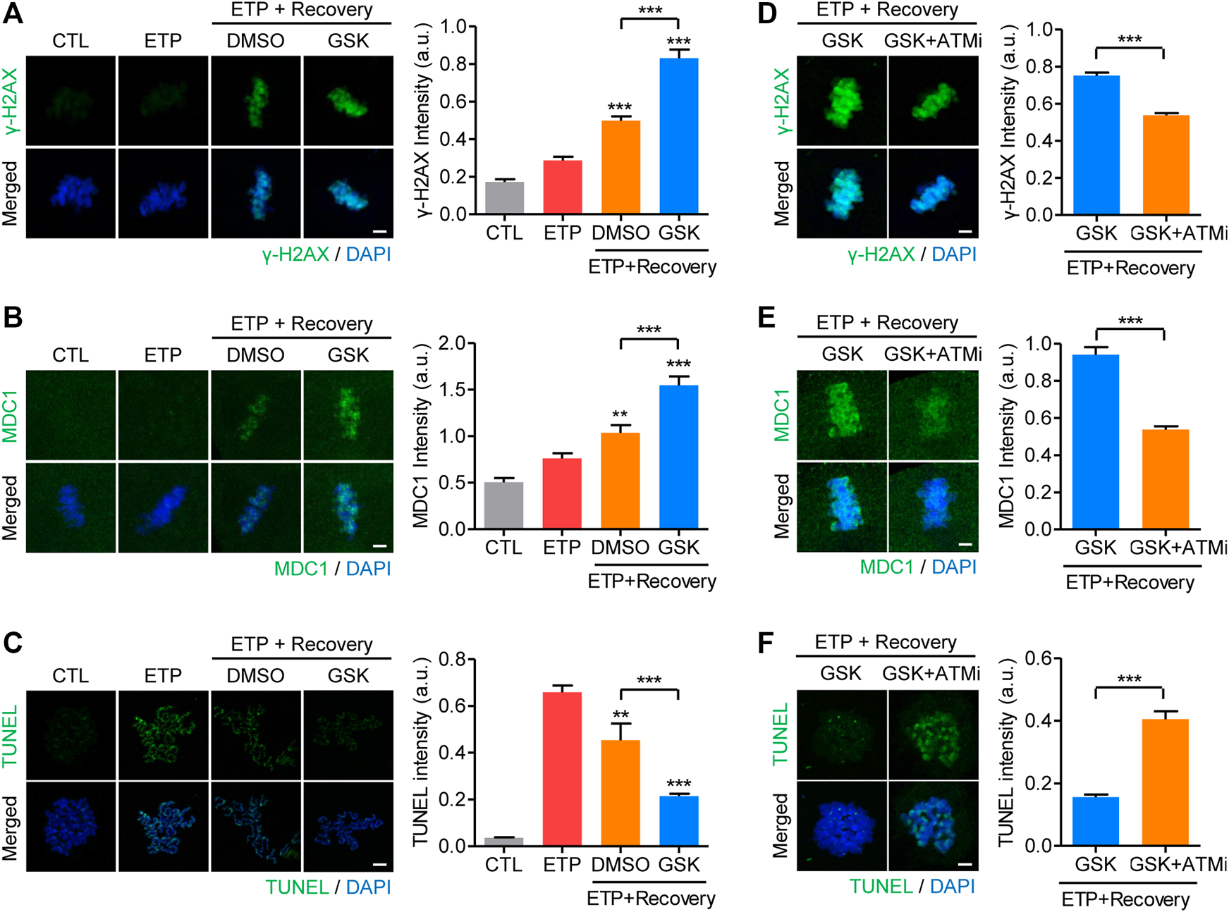WIP1 inhibition promotes DNA damage repair in aged oocytes. (A–C) After treatment with etoposide (ETP) or DMSO as a control (CTL), oocytes aged in vitro for 24 h were cultured in ETP-free medium for 1 h with GSK2830371 (GSK) or DMSO. The intensities of γ-H2AX (A), MDC1 (B), and TUNEL (C) signals were normalized to the mean DAPI intensity, and representative images are shown. DNA was counterstained with DAPI. Scale bar, 10 μm **p < 0.001; ***p < 0.0001, calculated using one-way ANOVA with Tukey’s post hoc test. (D–F) Oocytes aged in vitro were co-treated with an ATM inhibitor (ATMi) and GSK2830371 (GSK) during recovery from etoposide (ETP). The intensities of γ-H2AX (D), MDC1 (E) and TUNEL (F) signals were normalized to the mean DAPI intensity, and representative images are shown. DNA was counterstained with DAPI. Scale bar, 10 μm. Data are presented as the mean ± SEM of three independent experiments. ***p < 0.0001.