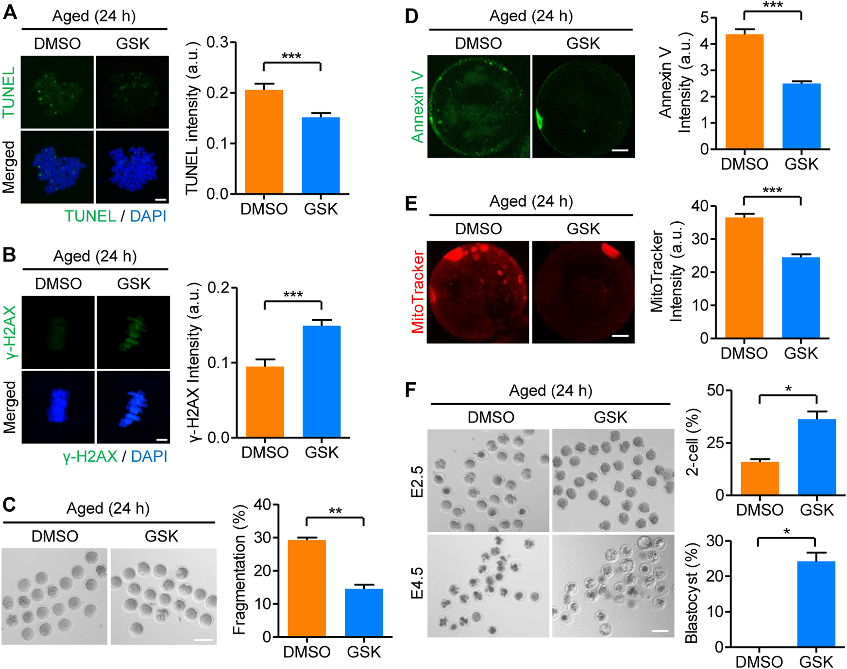 Prolonged inhibition of WIP1 during in vitro aging improves oocyte quality. MII oocytes were cultured in vitro for 24 h with GSK2830371 (GSK) or DMSO. (A,B) The intensities of TUNEL and γ-H2AX signals normalized to the mean DAPI intensity are shown using representative images. DNA was counterstained with DAPI. Scale bar, 10 μm. (C) Oocyte fragmentation was scored, and representative images are shown. Scale bar, 100 μm. (D) The intensity of Annexin V signals was scored, and representative images are shown. Scale bar, 20 μm. (E) The intensity of mitochondrial staining was scored, and representative images are shown. Scale bar, 20 μm. (F) The rate of 2-cell and blastocyst development is shown using representative images taken at 24 h (E2.5) and 72 h (E4.5) of culture after ICSI, respectively. Scale bar, 100 μm. Data are presented as the mean ± SEM from three independent experiments. *p < 0.05; **p < 0.001; ***p < 0.0001.