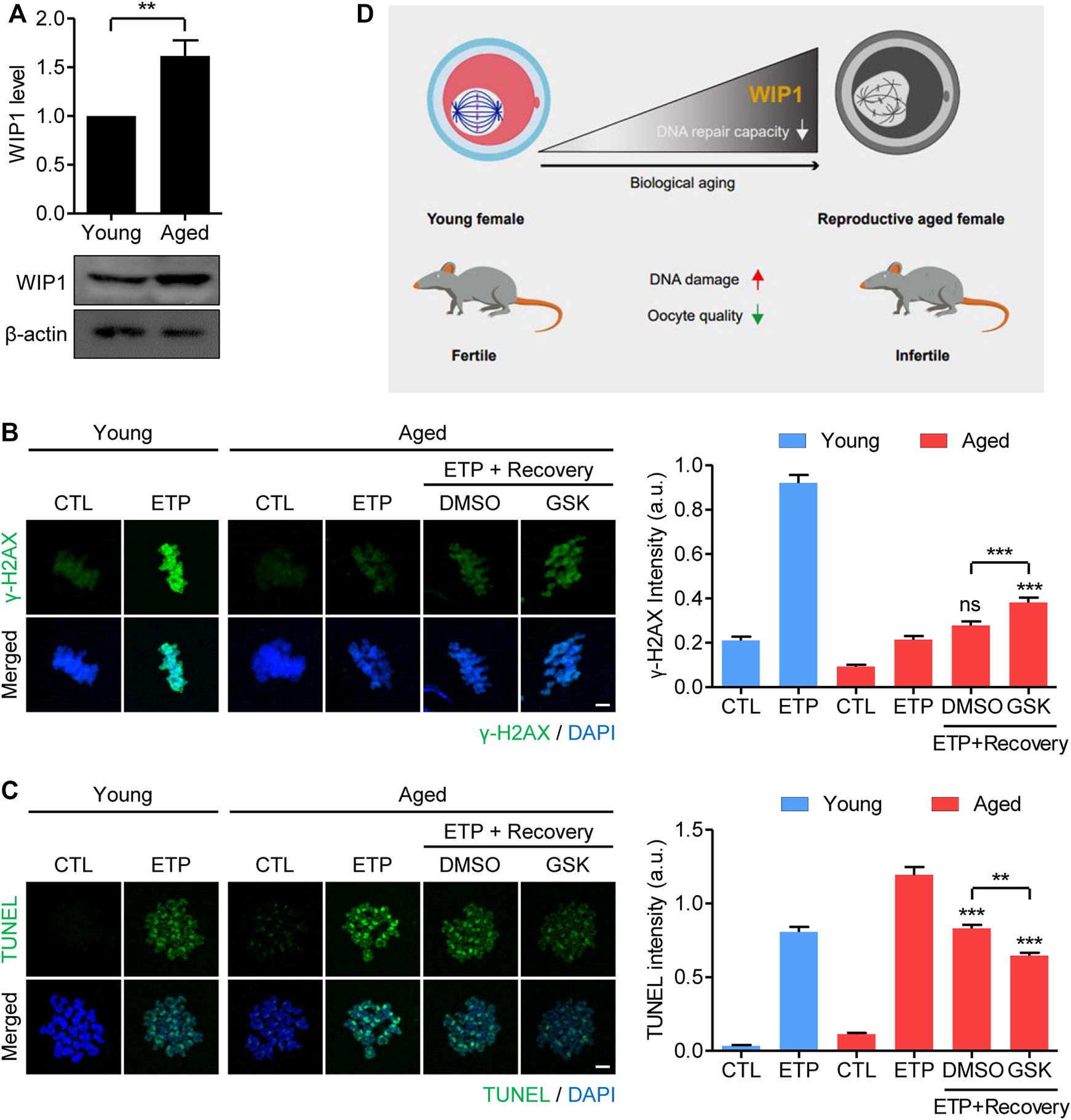 WIP1 inhibition increases the DNA repair capacity of oocytes from aged mice. (A) Increased WIP1 levels in maternally aged oocytes. MII oocytes were collected from young (8-week-old) and old (12-month-old) mice and subjected to immunoblot analysis using the WIP1 antibody, with ß-actin as a loading control. Each lane contains 50 oocytes. (B,C) Oocytes from young and old mice were treated with etoposide (ETP) or DMSO as a control (CTL) for 15 min. For recovery, the aged oocytes were cultured in ETP-free medium with GSK2830371 (GSK) or DMSO for 1 h after ETP exposure. The intensities of γ-H2AX and TUNEL, normalized to the mean DAPI intensity, are shown using representative images. DNA was counterstained with DAPI. Scale bar, 10 μm. Data were analyzed by one-way ANOVA followed by Tukey’s post hoc test and are expressed as the mean ± SEM of two independent experiments. **p < 0.001; ***p < 0.0001; ns, not significant. (D) A diagram showing the relationship between the aging-associated increase in WIP1 levels and the decline in DNA repair capacity in aged oocytes.