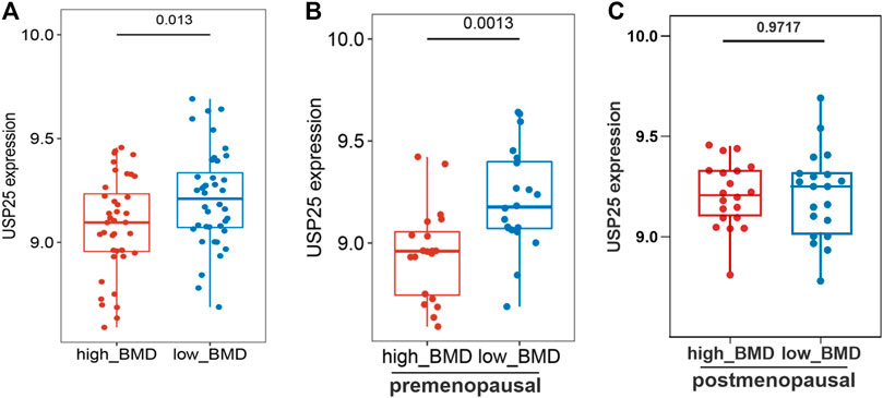 FIGURE 5. Correlation analysis of hub genes and clinical indicators (high and low density) in the turquoise module. (A) Differential gene expression of USP25 in all samples. (B) Differential gene expression of USP25 in premenopausal samples. (C) Differential gene expression of USP25 in postmenopausal samples.