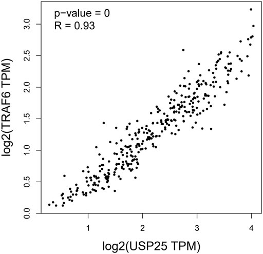 Previous studies have shown that the TRAF6 protein may be a substrate of USP25(B. Zhong et al., 2012). Therefore, we used GTEx expression datasets to analyze the correlation between USP25 and TRAF6 expression in whole blood. The results showed that in whole blood, the expression of USP25 was highly positively correlated with the expression of TRAF6 (R = 0.93, p < 0.001). Figure 10.