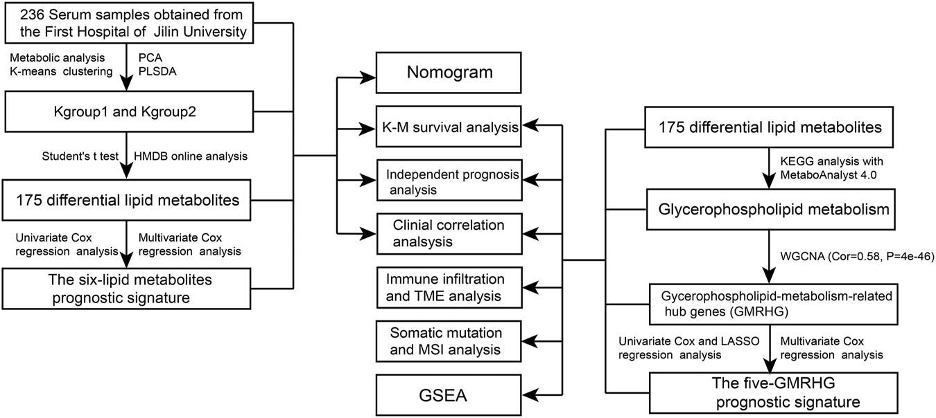 In this study, we firstly utilized LC-MS/MS to determine differential lipid metabolites altas based on the serum samples from 236 CRC patients. The functional enrichment analysis and multi-lipid metabolite prognostic signature analysis revealed the potential biological function and prognostic significance of differential lipid metabolites. Moreover, the prognosis of CRC patients was systematically evaluated by a composite nomogram. In the meantime, aiming at the most significant functional enrichment pathway enriching differential lipid metabolites, namely, glycerophospholipid metabolic pathway, we analyzed the prognostic value of GMRHG from the transcriptional level, and constructed the five-GMRHG prognostic signature. In addition, based on the five-GMRHG prognostic signature, we further expanded the significance of GMRHG in tumor immune infiltration, tumor mutation landscape, and antineoplastic therapy.