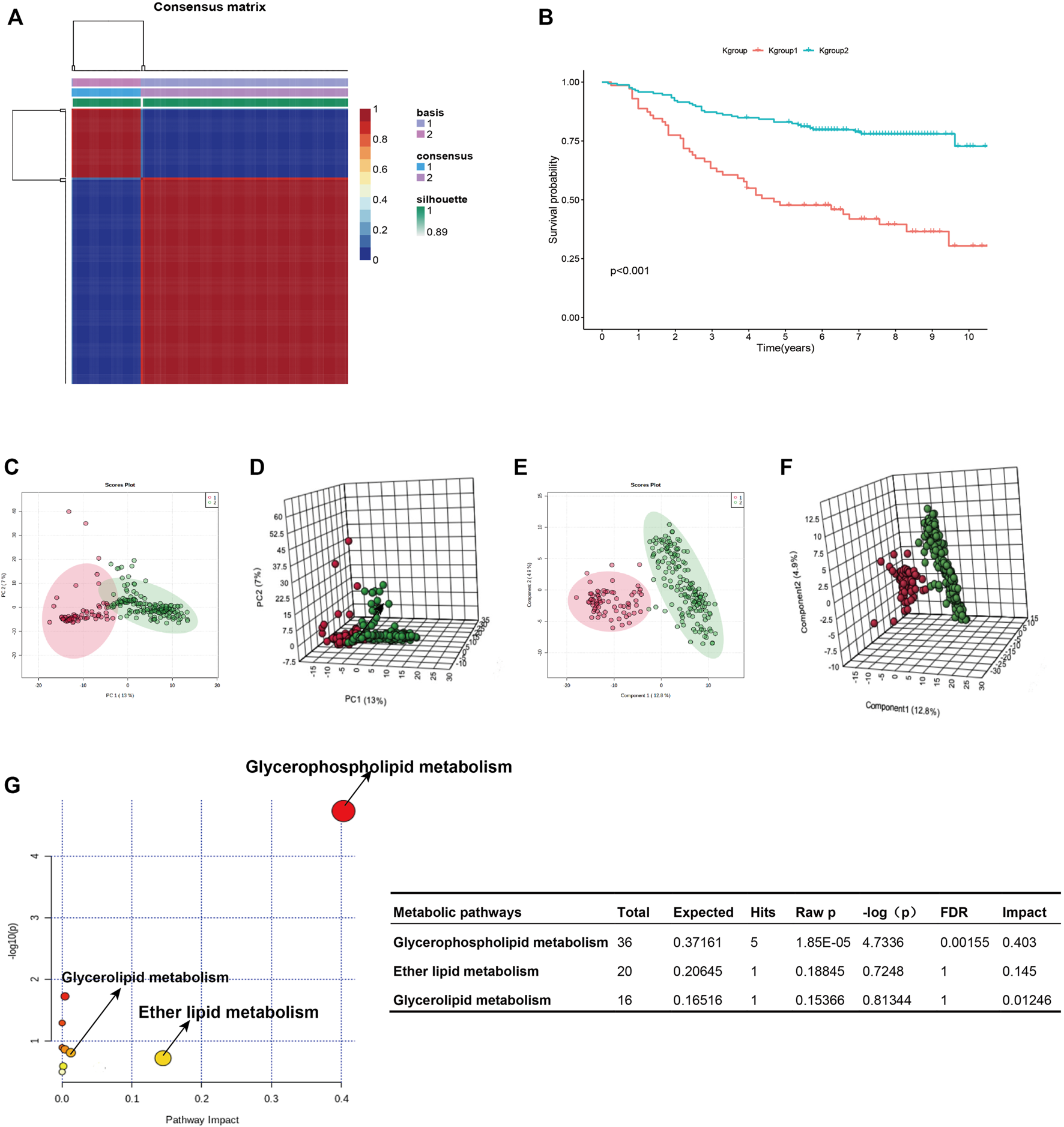 K-group1 and K-group2 are independent with each other. (A): K-means clustering heatmap of K-group1 and K-group2. (B): The K-M survival curves indicated that the overall survival of JLUFH CRC patients in K-group 1 was lower than that in K-group2. (C,D): Two-dimensional and three-dimensional PCA plots for K-group1 and K-group2. (E,F): Two-dimensional and three-dimensional PLSDA plots for K-group1 and K-group2. (G): The KEGG functional enrichment analysis for differential lipid metabolites.