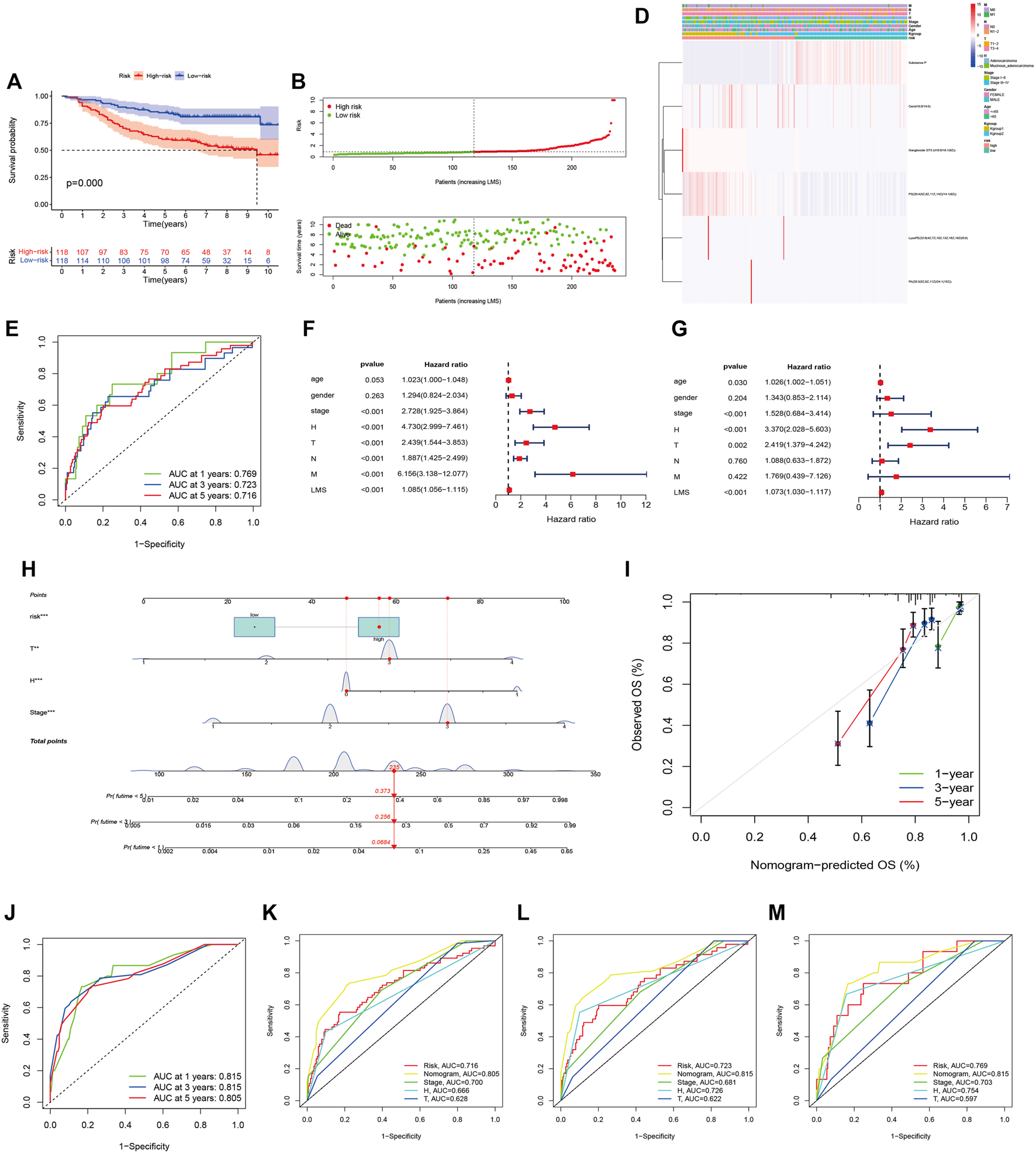The six-lipid-metabolite prognostic signature is the robust independent prognostic factor. (A): The K-M survival curves based on the six-lipid metabolite prognostic signature. (B): The scatter plot showing the correlation between the JLUFH CRC patients’ survival status and LMS. (C): The dot plot representing the distributions of JLUFH CRC patients’ LMS in the high- and low-risk groups. (D): The clustering heatmap exhibiting the level variation tendencies of the six lipid metabolites of the prognostic signature in various clinical characteristics, K-groups (K-group1 and K-group2) and risk grouping (High- and low-risk groups). (E): The one-, three-, and five-year ROC curves of the six-lipid-metabolite prognostic signature. (F,G): Univariate and multivariate independent prognostic analysis based on the six-lipid-metabolite prognostic signature, demonstrating that pathological stage, histological type and LMS could be deemed as the independent prognostic factors. (H): The composite nomogram consisted of independent prognostic factors. (I): The one-, three-, and five-year calibration curves of the composite nomogram. (J): The one-, three-, and five-year ROC curves of the composite nomogram. (K–M): The one-, three-, and five-year multi-index ROC curves of the composite nomogram.