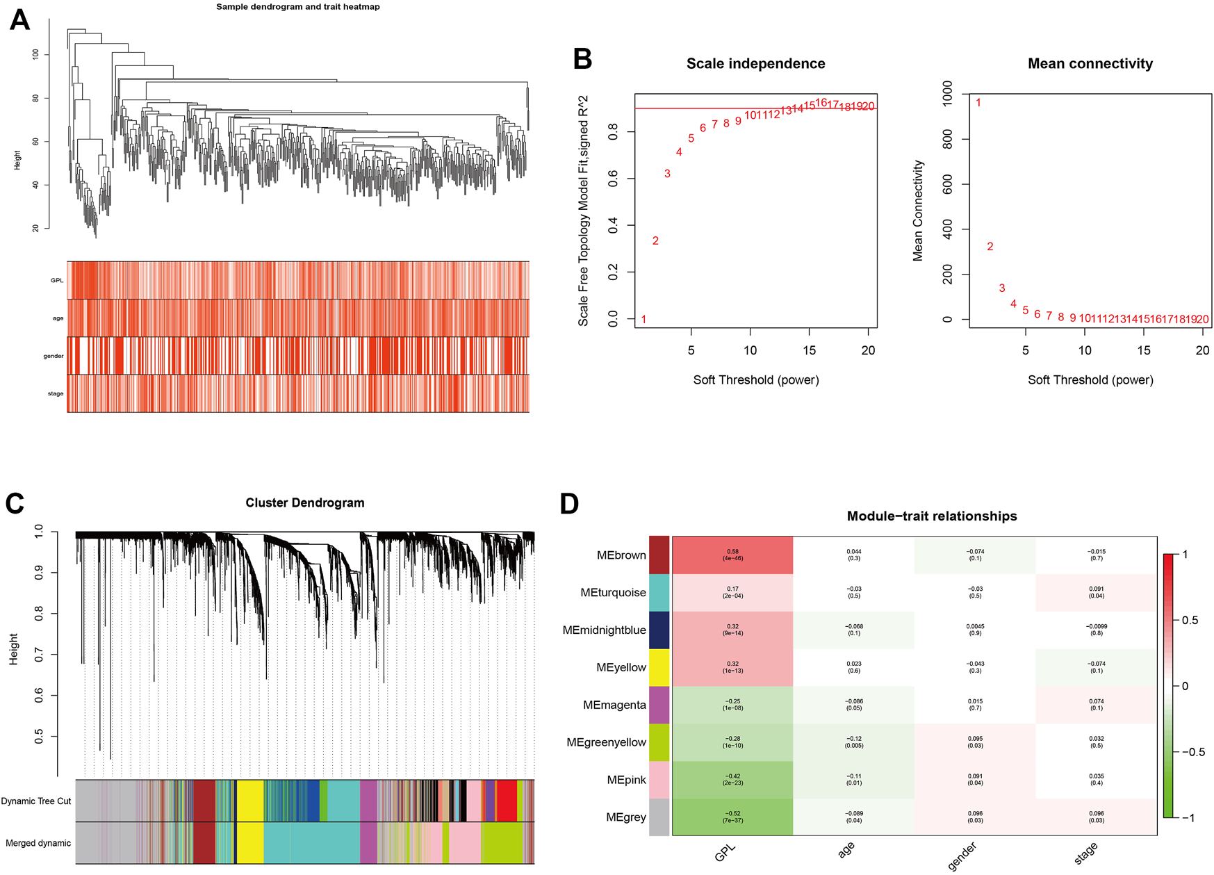 The identification of GMRHGs with WGCNA. (A): Hierarchical clustering dendrogram of TCGA CRC patients. (B): The selection of soft threshold. (C): The dynamic tree cut dendrogram for TCGA CRC patients. (D): The correlation between gene module and clinical traits.