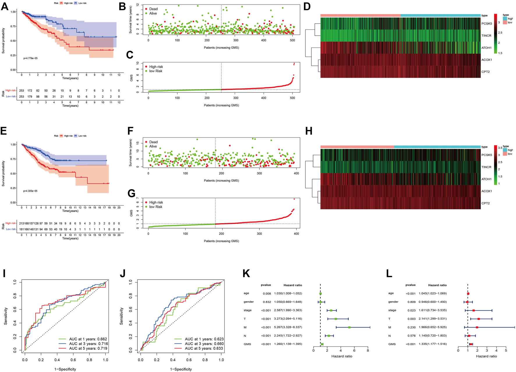 CRC patients stratified according to the five-GMRHG prognostic signature. (A–D): The survival plots for the TCGA CRC patients respectively illustrating the overall survival difference, the distribution of GMS, the survival status of CRC patients, and the expression variations of five GMRHGs in the high- and low-risk groups. (E)–(H): The survival plots for the GEO CRC patients (GSE17536, GSE38832 and GSE103479) respectively illustrating the overall survival difference, the distribution of GMS, the survival status of CRC patients, and the expression variation of five GMRHGs in the high- and low-risk groups. (I,J): The one-, three-, and five-year ROC curves of the five-GMRHG prognostic signature based on the training and test group. (K,L): The univariate and multivariate independent prognostic analysis.
