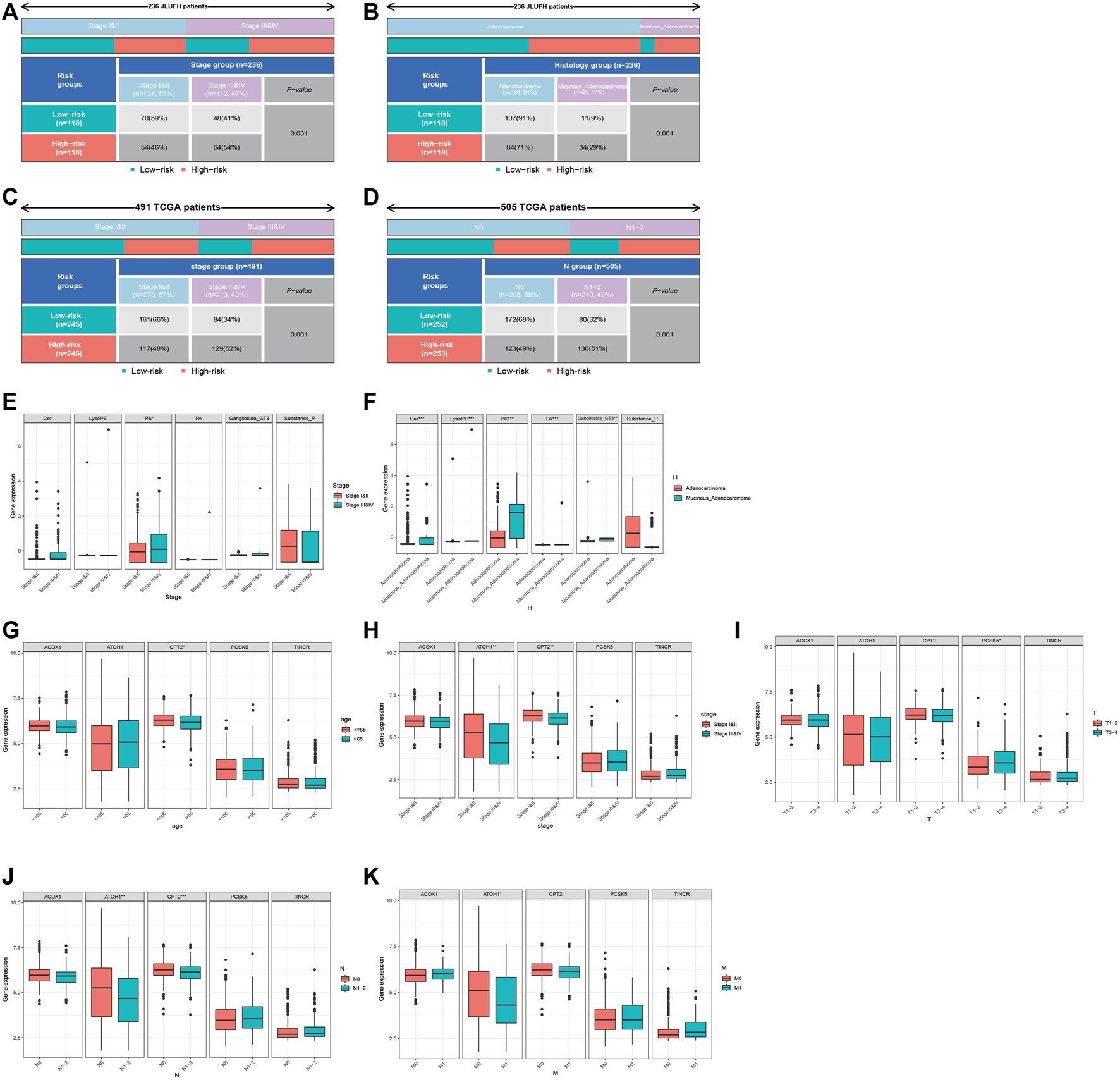 We used the Chi-square test to compare the distributions of clinical characteristics (age, gender, histological type, pathological stage, T staging, N staging, M staging) based on JLUFH CRC patients and TCGA CRC patients (age, gender, pathological stage, T staging, N staging, M staging) in the high- and low-risk groups. For the JLUFH CRC patients, we found that CRC patients with advanced pathological stage (stage III and IV) and mucinous adenocarcinomas were mainly distributed in the high-risk group with significant statistical difference (p = 0.031 and p = 0.001) (Figures 7A,B). For the TCGA CRC patients, we found that TCGA CRC patients with advanced pathological stage (stage Ⅲ and Ⅳ) and N staging (N1-2) were mostly distributed in the high-risk group (Figures 7C,D). Clinical correlation analysis with Wilcoxon ranking test was utilized to further explore the intra-group differences of six-lipid-metabolites level and five-GMRHG expression in clinical characteristics based on the JLUFH CRC patients and the TCGA CRC patients. “*”, “**”, and “***” respectively represented statistical difference, highly statistical difference, and significant statistical difference. It was found that the level of high-risk lipid metabolite, PS [20:4 (5Z, 8Z, 11Z, 14Z)/14:1 (9Z)], was higher in the JLUFH CRC patients in the advanced-pathological-stage group (Figure 7E), and the levels of five high-risk lipid metabolites (Cer(d18:0/14:0), Ganglioside GT3(d18:0/18:1(9Z), LysoPE[22: 6 (4Z, 7Z, 10Z, 13Z, 16Z, 19Z)/0: 0], PA[20:3 (5Z,8Z, 11Z)/24:1 (15Z)], PS[20:4 (5Z, 8Z, 11Z, 14Z)/14:1 (9Z)] in the mucinous-adenocarcinoma group were significantly higher than those in the adenocarcinoma group (Figure 7F). The expression of CPT2 was higher in the TCGA CRC patients no more than 65 years old compared with that in CRC patients greater than 65 years old (Figure 7G). Furthermore, the expressions of ATOH1 and CPT2 presented statistical differences in terms of pathological stage. The expression of ATOH1 and CPT2 was higher in stage Ⅰ and Ⅱ than that in stage Ⅲ and Ⅳ (Figure 7H). In T staging, the expression of PCSK5 in T3-4 was higher than that in T1-2 (Figure 7I). Moreover, in N staging, with the increase of N staging, the expression of ATOH1 and CPT2 displayed downward tendencies (Figure 7J). For M staging, the expression of ATOH1 was higher in M0 than in M1 with statical differences (Figure 7K).