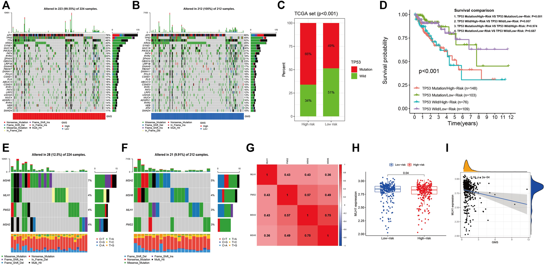 The somatic mutation data retrieved from the TCGA “Masked Somatic Mutation” data type was summarized with the “maftools R package” to depict the genetic mutational landscape of CRC patients and of the characteristic genes of mismatch repair (MMR) system, namely, MLH1, MSH2, MSH6, and PMS2.