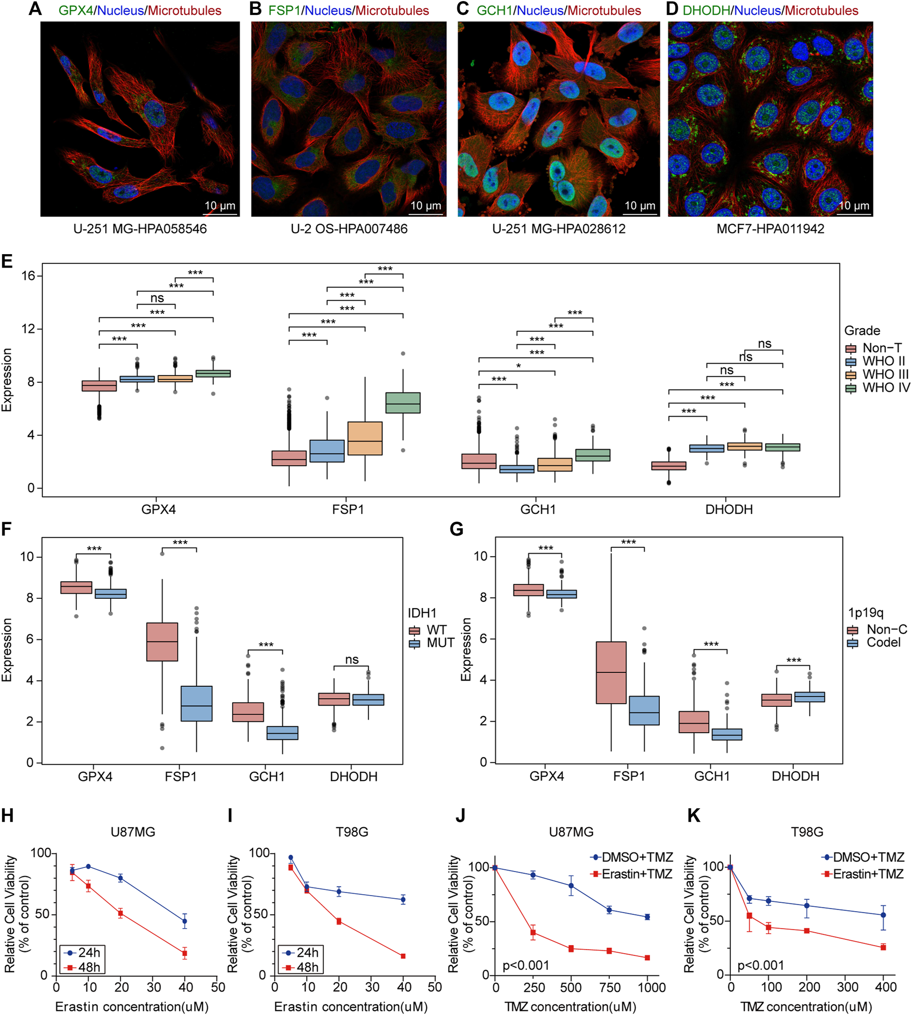 Ferroptosis plays an potential biological role in the progression and treatment of glioma. (A–D) Confocal immunofluorescence staining for GPX4, DHODH, GCH1, FSP1 in cell lines from HPA database. Green, antibody; blue, nucleus; red, microtubules. (E–G) Boxplots of GPX4, GCH1, FSP1 and DHODH expression in different grade, IDH1-status and 1p19q-codeletion-status glioma samples from TCGA database. ns, no significance; *p < 0.05; **p < 0.01; ***p < 0.001. (H,I) The cell viability of U87MG and T98G cells transfected with erastin was evaluated by the CCK-8 assays in 24 and 48 h. Five technical repeats were performed for two biological repeats. (G,K) The cell viability of U87MG and T98G cells transfected with erastin and temozolomide was evaluated by the CCK8 assays in 48 h. Five technical repeats were performed for two biological repeats.