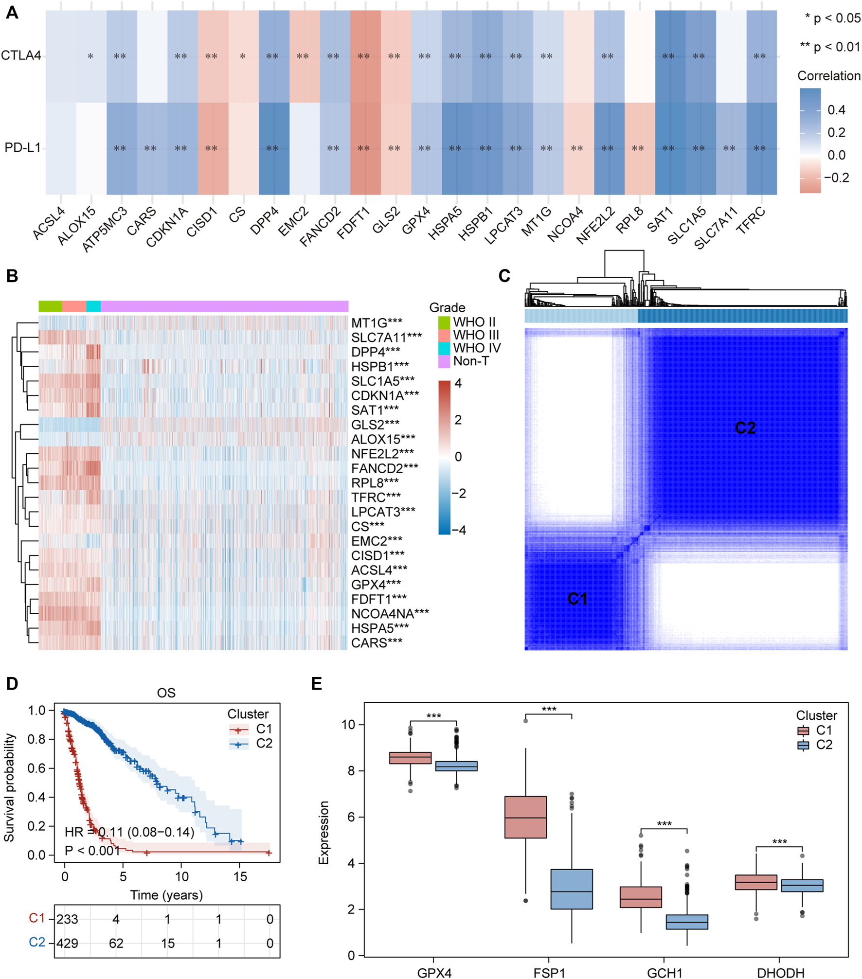 Two ferroptosis-related subtypes were identified based on the expression profile of FRGs. (A) Correlation heatmap between 24 FRGs expression and PDL-L1/CTAL4. Blue, positive correlation; red, negative correlation. *p < 0.05, **p < 0.01. (B) Heatmap depicted the FRGs expression profile landscape in gliomas of TCGA database. Red, high expression, blue, low expression. (C) Consensus clustering matrix for k = 2. (D) Kaplan–Meier analysis of patients in the two different ferroptosis-related subtypes. (E) Boxplots of GPX4, GCH1, FSP1 and DHODH expression level in the two different ferroptosis-related subtypes. ns, no significance; *p < 0.05; **p < 0.01; ***p < 0.001.