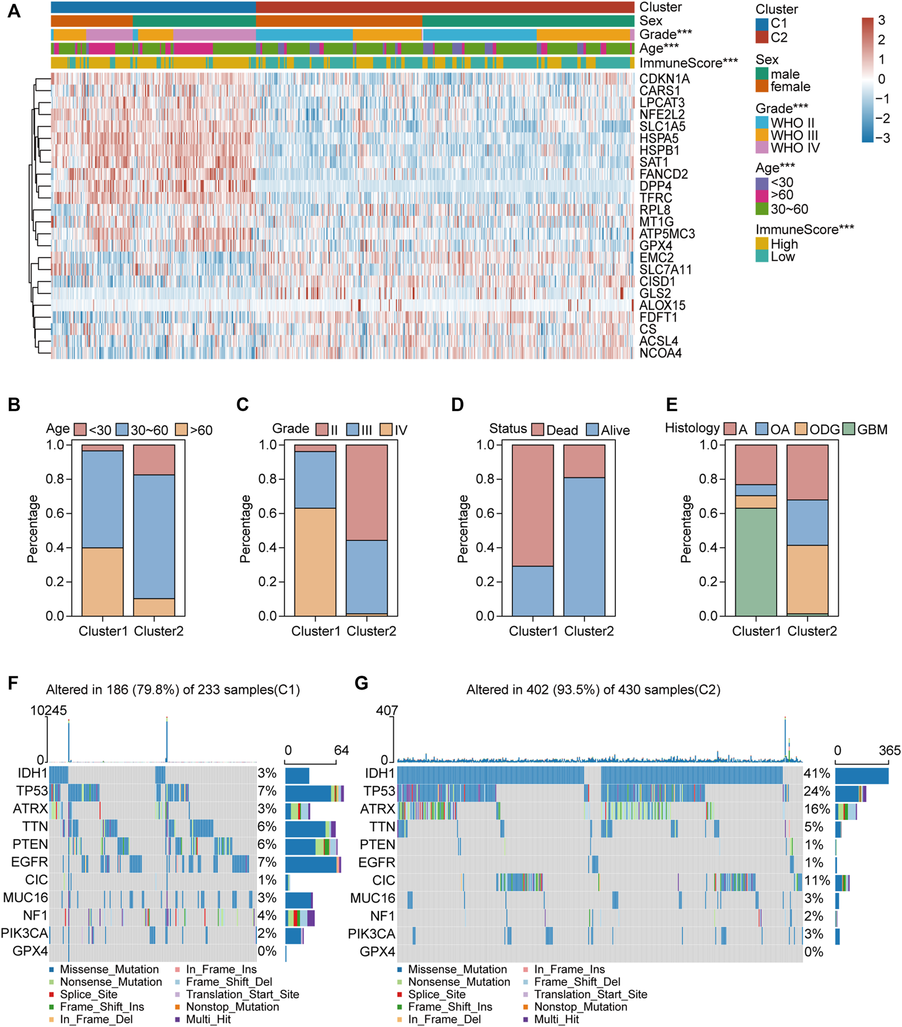 Clinical features and somatic landscapes of two ferroptosis-related subtypes. (A) Heatmap visualized the distribution of sex, age, grade, immuneScore between the two ferroptosis-related subtypes. *p < 0.05; **p < 0.01; ***p < 0.001. (B–E) Histograms depicted the differences of age, grade, status and histology between two ferroptosis-related subtypes. (F,G) Oncoplot displaying the somatic landscape of glioma cohort of two ferroptosis-related subtypes. Genes are ordered by their mutation frequency, and samples are ordered according to disease histology as indicated by the annotation bar (bottom). Side bar plot shows log10 transformed Q-values estimated by MutSigCV. Landscape of mutation profiles in OC samples. Mutation information of each gene in each sample was shown in the waterfall plot, where different colors with specific annotations at the bottom meant the various mutation types. The bar plot above the legend exhibited the number of mutation burden.