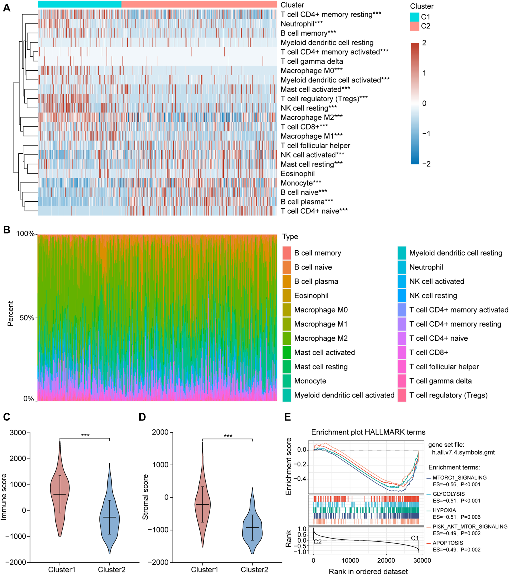 Different immune cell infiltration between two ferroptosis-related subtypes. (A) Immune cell score heat map, where different colors represent the expression trend in each sample between two ferroptosis-related subtypes. *p < 0.05, **p < 0.01, ***p < 0.001. (B) The percentage abundance of tumor infiltrating immune cells in each sample, with different colors and different types of immune cells. The abscissa represents the sample, and the ordinate represents the percentage of immune cell content in a single sample. (C,D) Violin plots of the immuneScore and stromalScore between the two ferroptosis-related subtypes. *p < 0.05, **p < 0.01, ***p < 0.001. (E) The enrichment plots of representative Gene Set Enrichment Analysis (GSEA) results. ES, enrichment score.