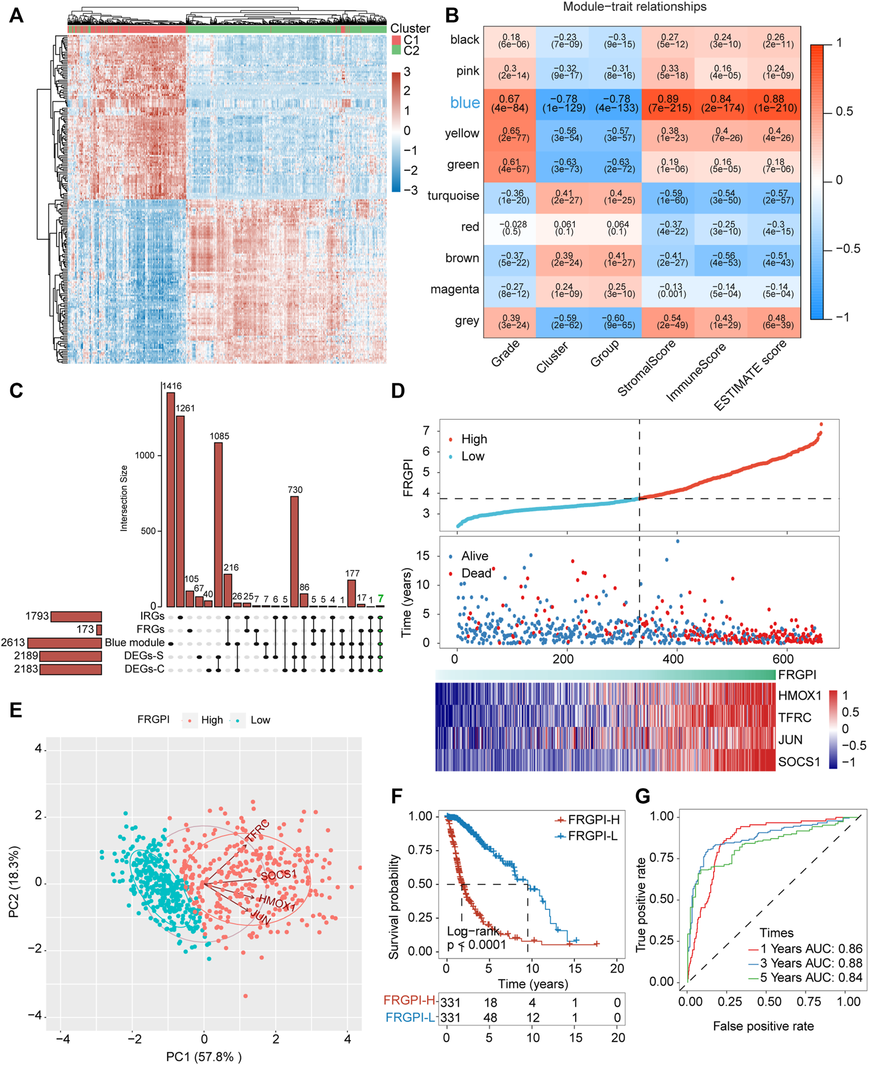 FRGPI was developed based on FRGs for glioma. (A) Differential gene expression heat map, where different colors represent expression trends in different tissues. Due to the large number of differential genes, the 50 up-regulated genes and 50 down-regulated genes with the largest differential changes are shown here. (B) Correlation of weighted gene correlation network analysis (WGCNA) modules with ferroptosis-related subtypes and immuneScore. (C) Upset plot for DEGs between the two ferroptosis-related subtypes, DEGs between the two ferroptosis-related subgroups, FRGs, IRGs and genes in blue module. IRGs, immune-related genes. (D) FRGPI, survival outcome and HMOX1, TFRC, JUN and SOCS1 expression profiles of each sample are shown. (E) Principal component analysis (PCA) plot of glioma samples based on HMOX1, TFRC, JUN and SOCS1 expression profiles. (F) Kaplan–Meier analysis of glioma patients with low or high FRGPI. (G) ROC curves predicted prognostic value of FRGPI in glioma patients.