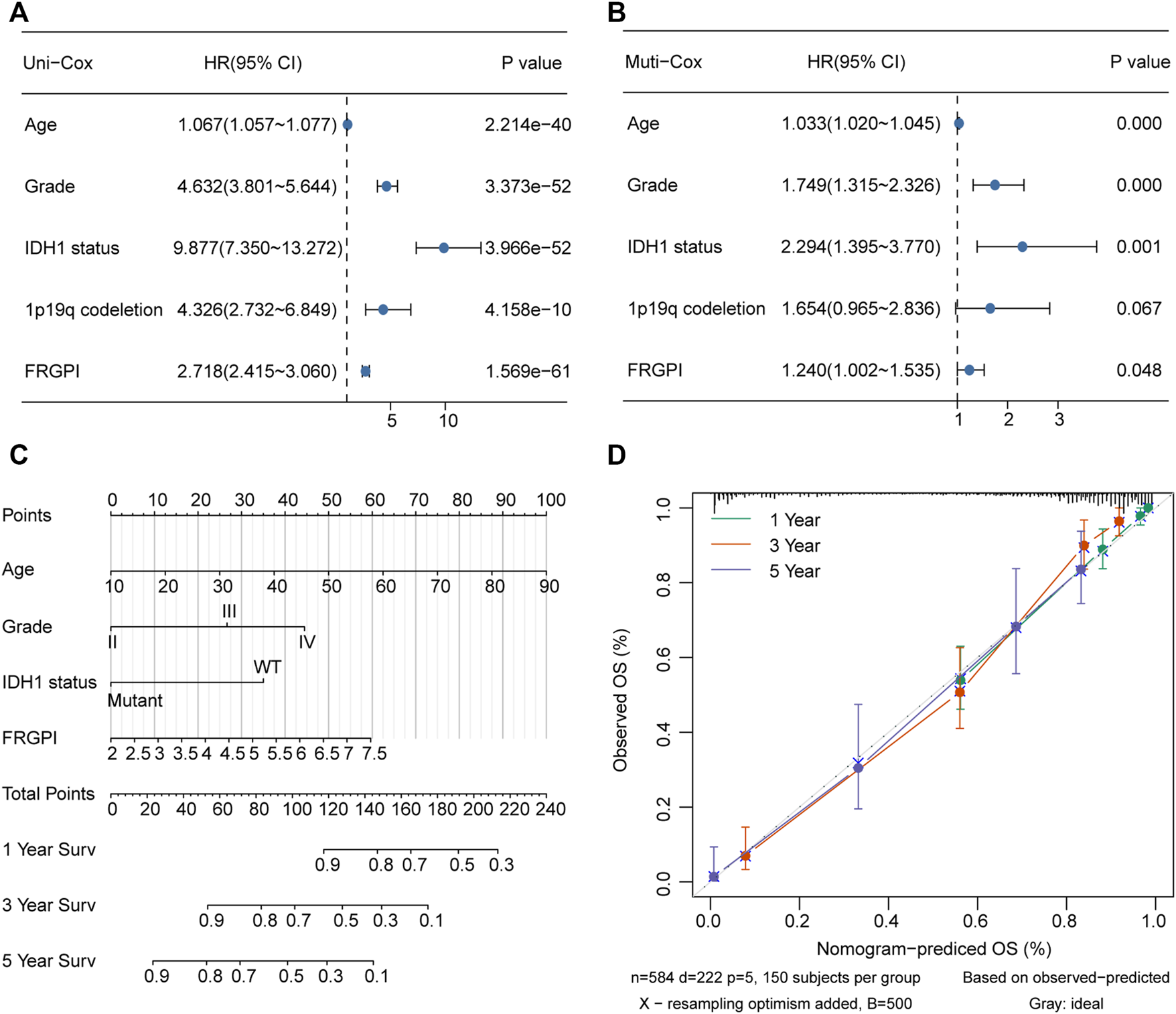 Nomogram was constructed to calculated prognostic risk score for individual. (A,B) Hazard ratio and p-value of constituents involved in univariate and multivariate Cox regression for FRGPI, age, grade, IDH1 status and 1p19q codeletion in TCGA glioma samples. (C) Nomogram to predict the 1-, 3- and 5-year OS of glioma patients. (D) Calibration curve indicated that predicted 1-, 3- and 5-year survival rates were close to the actual survival rates. The gray dashed diagonal line represents the ideal nomogram, and the green line, red line and blue line represent the 1-, 3- and 5-y observed nomograms.
