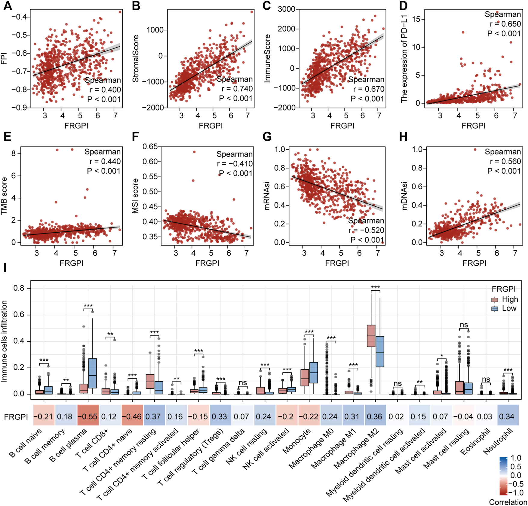 Anti-tumor immunity and intrinsic immune escape associated with FRGPI. Spearman correlation coefficients and associated p-value of FRGPI with (A) FPI, (B) stromalScore, (C) immuneScore, (D) the expression of PD-L1, (E) TMB score, (F) MSI score, (G) mRNAsi, (H) mDNAsi are shown. r, Spearman coefficient; ns, no significance; *p < 0.05; **p < 0.01; ***p < 0.001. (I) Different immune cell infiltration between high and low FRGPI group, and the correlation between FRGPI and immune cells infiltration. ns, no significance; *p < 0.05; **p < 0.01; ***p < 0.001; blue, positive correlation; red, negative correlation.