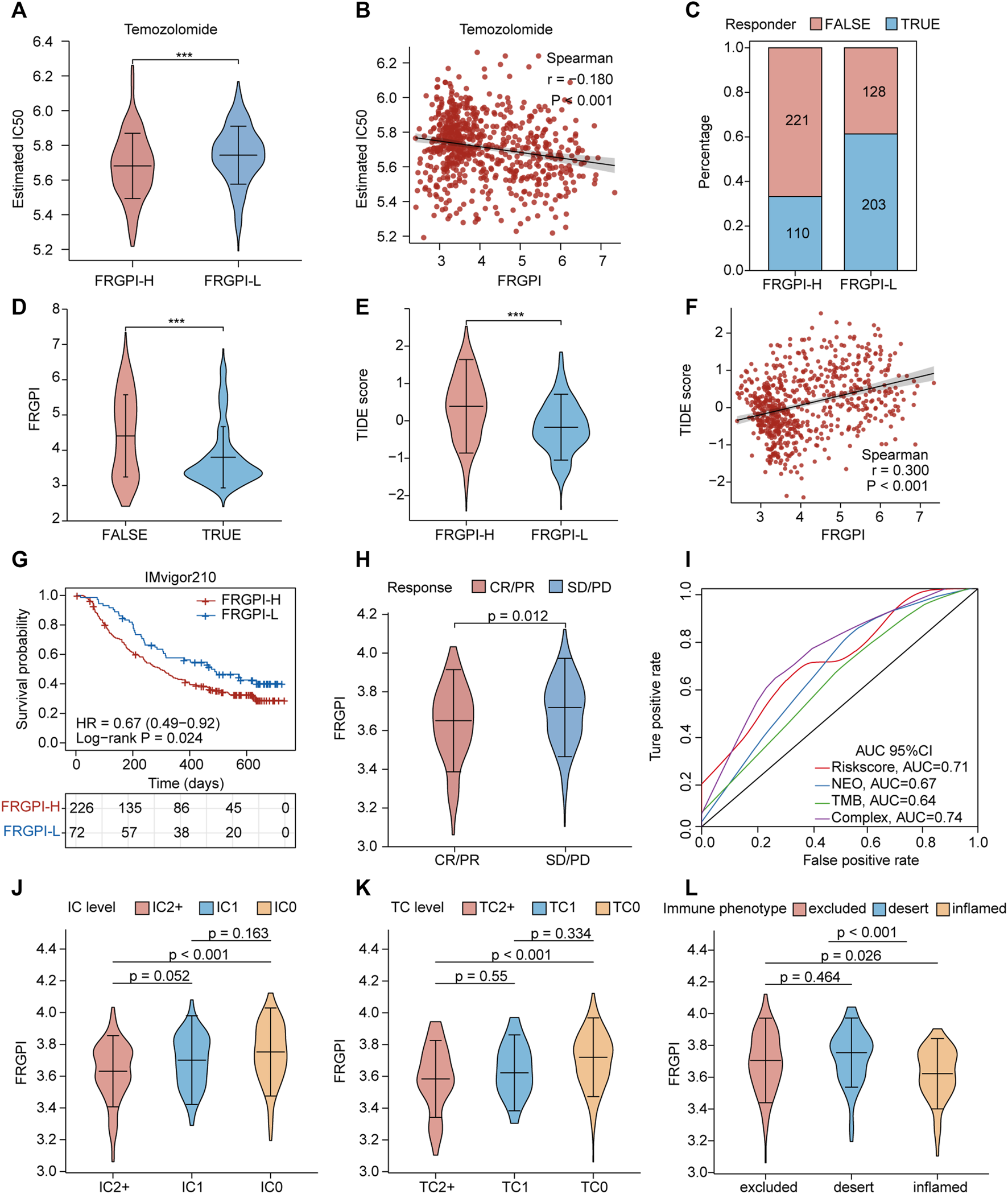 FRGPI is predictive of temozolomide sensitivity and ICI response in glioma. (A) Different estimated temozolomide IC50 between high and low FRGPI group. (B) The spearman correlation between FRGPI and estimated temozolomide IC50. The ICI response of each patient in high and low FRGPI group was predicted by TIDE algorithm, (C) stacked histogram showed the distribution of “TURE” or “FALSE” responder in high and low FRGPI group; (D,E) Violin plots showed the FRGPI level of “TURE”- and “FALSE”-responder group, and the different TIDE score between high- and low-FRGPI group. (F) The spearman correlation between FRGPI and TIDE score. (G) Kaplan–Meier curves showing overall survival in patients with low or high FRGPI in the anti-PD-L1 cohort. (H) The distribution of FRGPI in distinct anti-PD-L1 clinical response groups. (I) Roc curves showing predicting value of FRGPI, neoantigen (NEO), TMB and complex (FRGPI combined with NEO and TMB) group for anti-PD-L1 therapy response. CR, complete response; PD, disease progression, PR, partial response; SD, stable disease. (J–L) Distribution of the FRGPI in distinct IC-level, TC-level and immune-phenotype group respectively in the anti-PD-L1 cohort. IC-level, PD-L1 expression level on immune cells; TC-level, PD-L1 expression level on tumor cells.