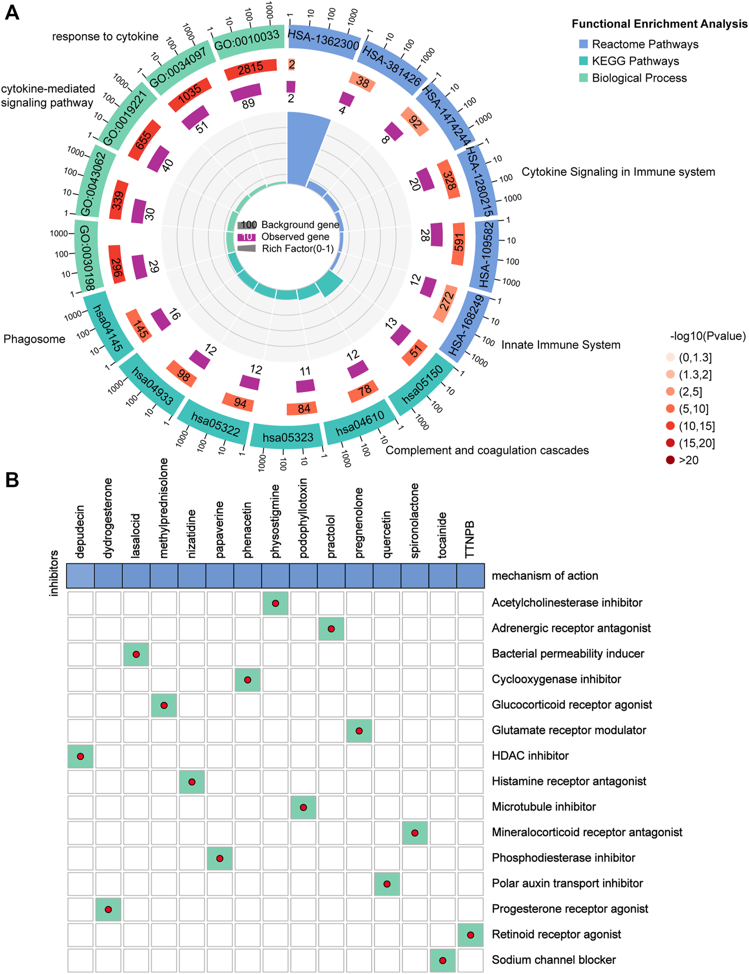 Potential small molecule compounds based on PRGPI. (A) Function enrichment analysis results of 263 DEGs between the high and low FRGPI groups. (B) Candidate small molecular drugs and mechanisms of action were discovered based on FRGPI. The abscissa represents the drugs, and the ordinate represents drug mechanisms of action.