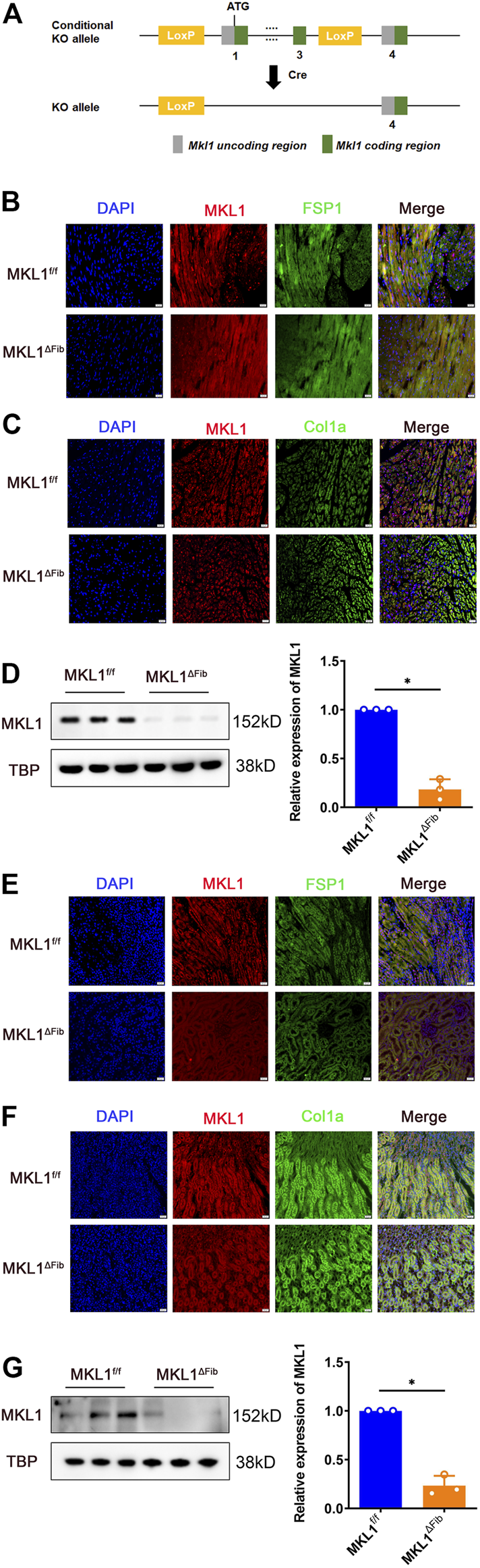 Validation of MKL1 deletion in resident fibroblasts. WT and CKO mice were injected with tamoxifen (50 mg/kg) for 10d. (A) Scheme of protocol. (B) MKL1+FSP1+ cells in cardiac tissue were measured by immunofluorescence staining. Scale bar, 20 μm. (C) MKL1+Col1a+ cells in cardiac tissue were measured by immunofluorescence staining. Scale bar, 20 μm. (D) primary cardiac fibroblasts were isolated from the MKL1ΔFib heart and the MKL1f/f heart, western blotting detected the MKL1 protein level. (E) Immunofluorescence staining showed the MKL1+FSP1+ cells in renal tissue. Scale bar, 20 μm. (F) Immunofluorescence staining showed the MKL1+Col1a+ cells in renal tissue. Scale bar, 20 μm. (G) Western blotting detected the MKL1 protein level in MKL1ΔFib and the MKL1f/f renal resident fibroblasts. N = 3 mice. Data represent mean ± SD. *p < 0.05, two-tailed t-test.