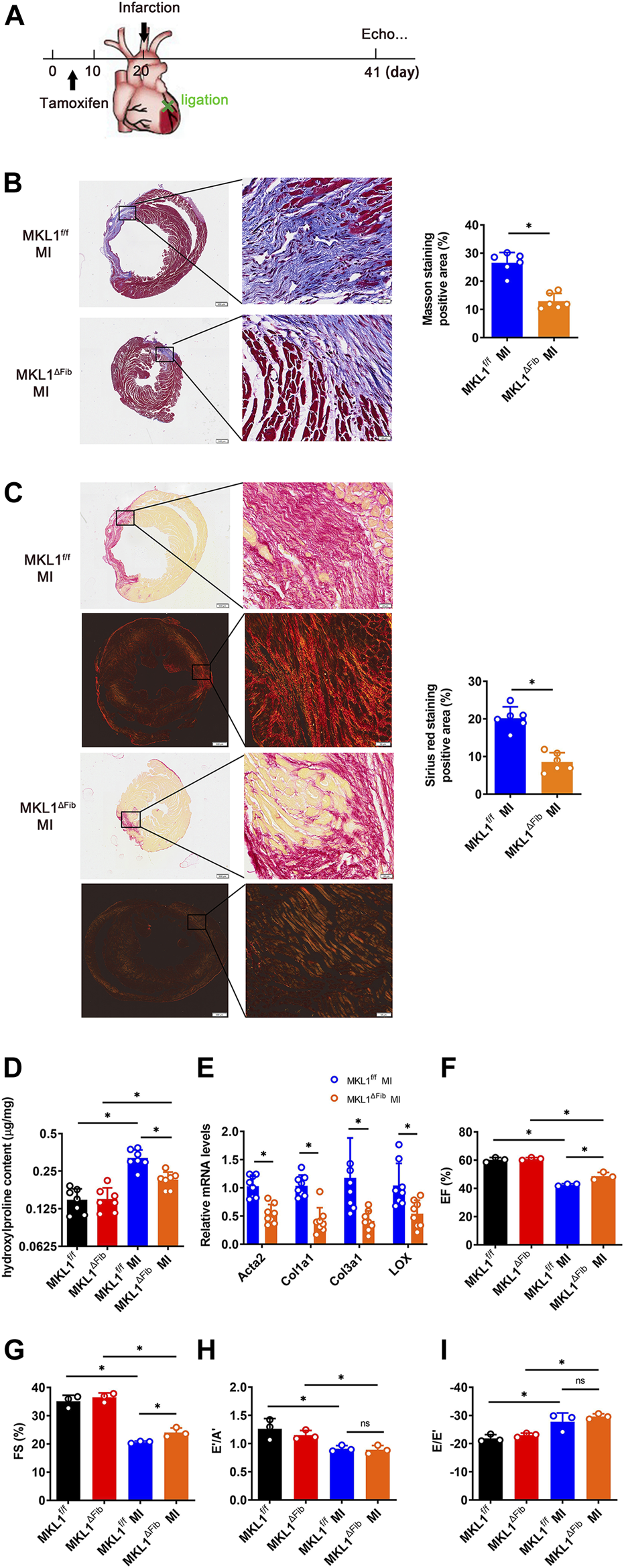 MKL1 deletion in resident fibroblasts attenuates cardiac fibrosis. (A) Schematic diagram of myocardial infarction (MI)-induced cardiac fibrosis in MKL1f/f and MKL1ΔFib mice. Tamoxifen (50 mg/kg/d) was injected into mice by intraperitoneal injection (i.p.) for 10 days. The mice were then subjected to MI surgery for 21 days. (B) Masson’s trichrome staining. Scale bar, 500 μm. N = 6 mice. (C) Picrosirius red staining under white light or polarized light. Scale bar, 500 μm. N = 6 mice. (D) Hydroxylproline level were detected by test kit. N = 7 mice. (E) Pro-fibrogenic genes were measured by RT-qPCR. N = 8 mice. (F) Ejection fraction (EF) values. N = 3 mice. (G) Fractional shortening (FS) values. N = 3 mice. (H) Late diastolic transmitral flow velocity (E’/A′) values. N = 3 mice. (I) Early diastolic mitral annular velocity (E/E′) values. N = 3 mice. Data represent mean ± SD. *p < 0.05, two-tailed t-test.
