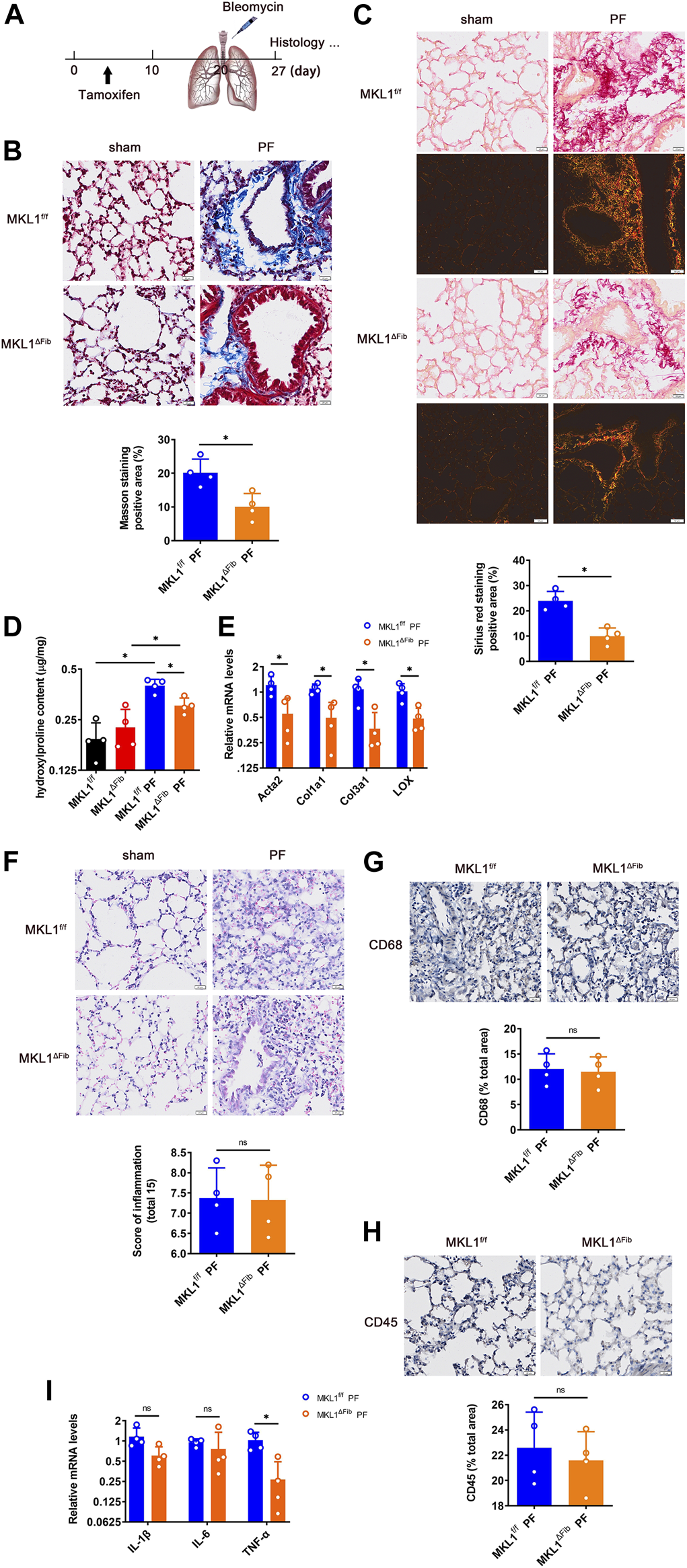 On the other hand, H&E staining (Figure 4F) indicated that gross pulmonary morphology was not significantly different between the two groups. Immunohistochemical staining performed with an anti-CD68 antibody (Figure 4G), which labels macrophages, and an anti-CD45 antibody (Figure 4H), which labels granulocytes, showed similar levels of immune infiltrates in the MKL1ΔFib lungs and in the MKL1f/f lungs. Finally, when expression of pro-inflammatory cytokines in the cells from the bronchoalveolar lavage fluid (BALF) was examined, it was found that levels of tumor necrosis factor (Tnfa), but not interleukin 1 (Il1b) or interleukin 6 (Il6), were lower in the MKL1ΔFib mice than in the MKL1f/f mice (Figure 4I).