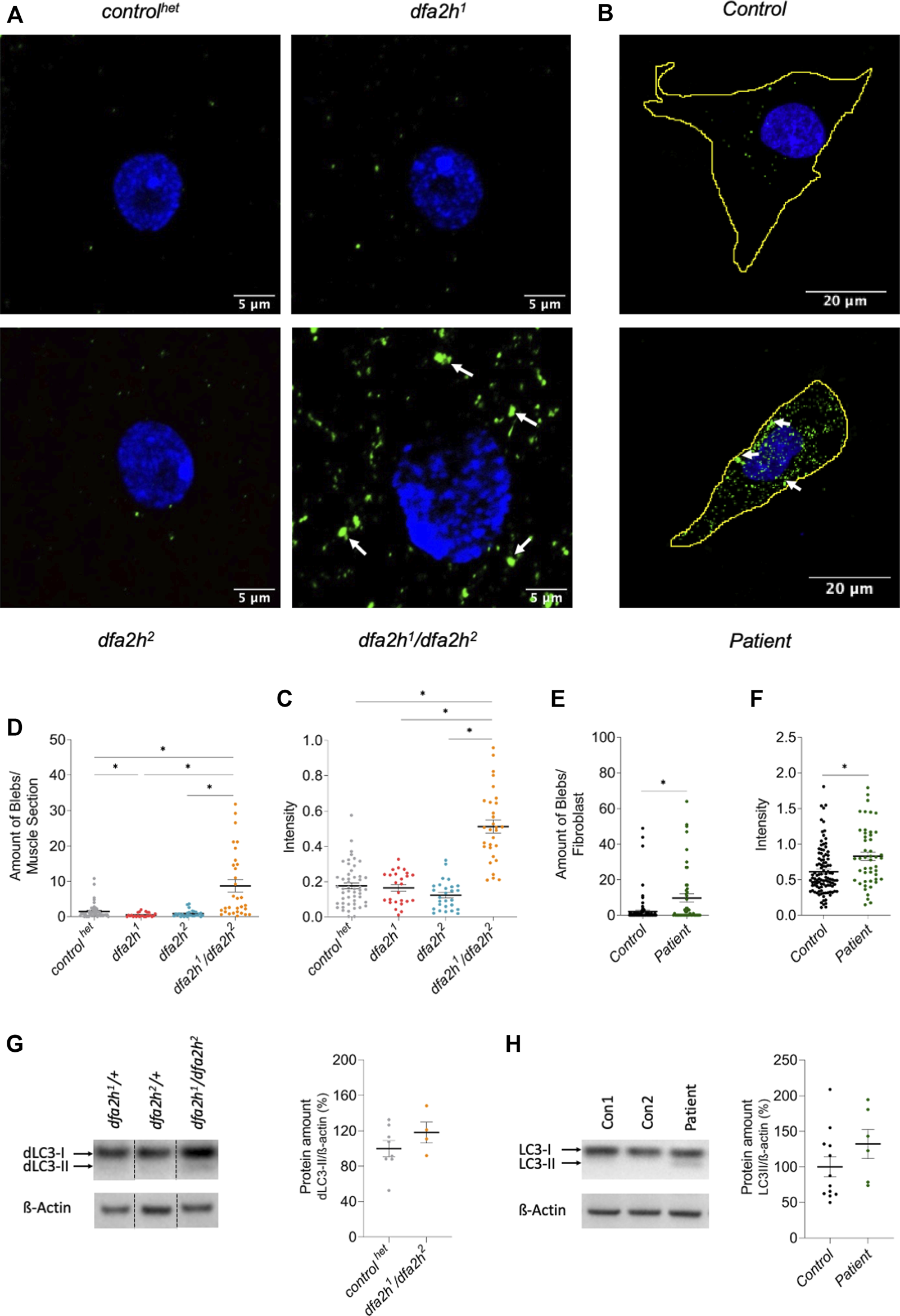 Lack of FA2H leads to altered autophagy. (A–C) Immunolabeling of larval muscle sections using autophagy marker dLC3. (A) Confocal microscopy images show autophagy alteration in compound heterozygous dfa2h mutant. The green labeling shows dLC3 labeling visualizing autophagy, and the blue signal DAPI labeling to visualize the nucleus. The arrows indicate dLC3 accumulations. (B)dfa2h1/dfa2h2 mutant flies present with a higher number of blebs bigger than 0.1 µm2 compared to controlhet and homozygous dfa2h mutants. (C) Compound heterozygous mutant demonstrates stronger mean intensity of fluorescent signal compared to controlhet and homozygous dfa2h mutants. The dots represent single data points, and the lines show mean ± SEM (n = 25–50). (D–F) Immunolabeling of patient-derived fibroblasts using the autophagy marker LC3. (D) Confocal microscopy images demonstrate autophagy alteration upon loss of FA2H. The green fluorescence shows LC3 labeling visualizing autophagy, and the blue signal DAPI labeling to visualize the nucleus. The arrows indicate LC3 accumulations. (E) Patient-derived fibroblasts show a higher number of blebs bigger than 0.4 µm2. (F) Lack of FA2H presents with an increased mean intensity of the fluorescent signal. The dots represent single data points, and the lines show mean ± SEM (n = 48-105). The Kruskal–Wallis test was performed for group comparison with a significance level of p < 0.05 (B-C*). For pairwise comparison, Mann-Whitney-U-Test was performed. (G–H) Western blot analysis of LC3 expression level. (G) Compound heterozygous dfa2h1/dfa2h2 flies present with an increase in dLC3-II levels, indicating alterations of autophagy. These findings are consistent with the findings in (H) fibroblasts. The expression levels were normalized to ß-Actin expression. The dots represent single data points as percentages, with the controls set to 100%. The lines show mean ± SEM (nflies = 4–8; nfibroblasts = 6–12).